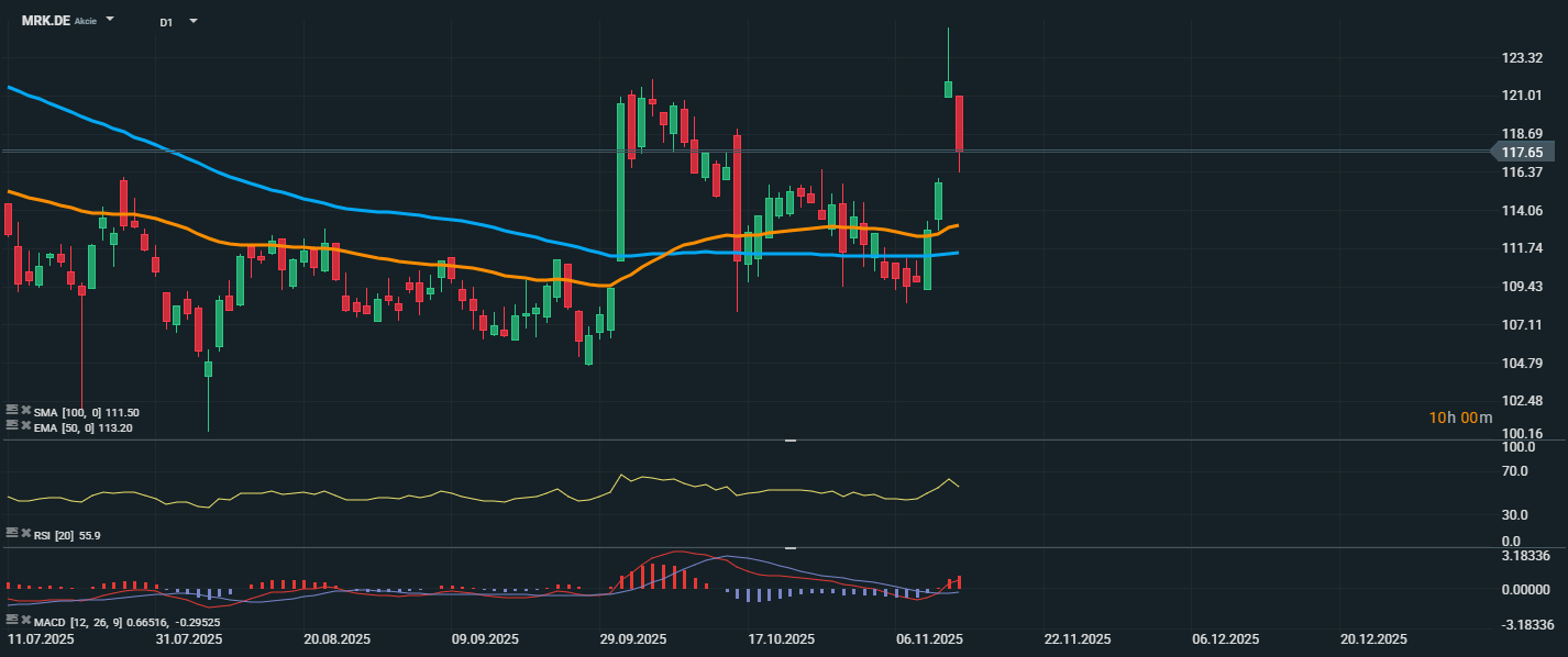 Akcie Merck se aktuálně obchodují na úrovni 117,65 EUR, cena akcií se stále pohybuje nad EMA 50 (113,20 EUR) a SMA 100 (111,50 EUR). RSI se posunul na 55,9, což značí neutrální až mírně pozitivní momentum.