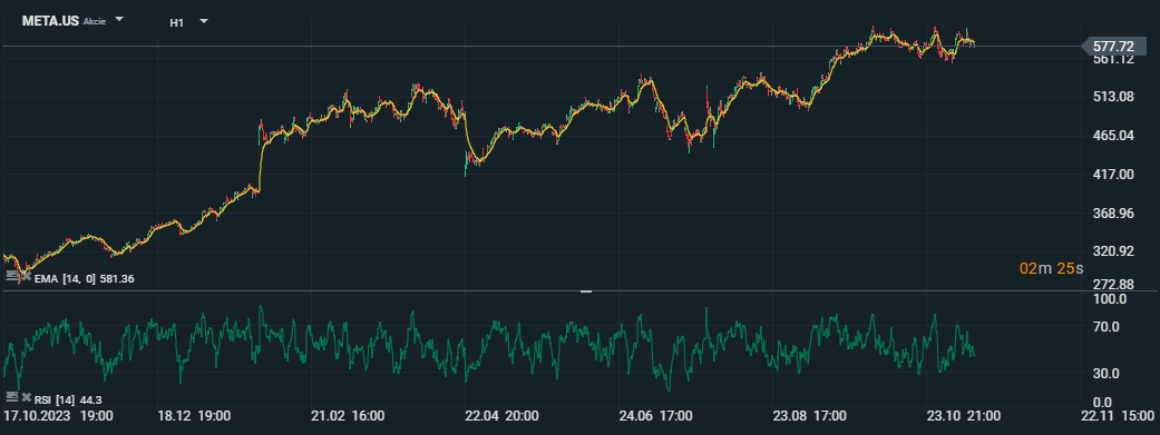 Meta Platforms (META.US) Graf: Ukazatelé EMA a RSI naznačují mírné zpomalení po dosažení hodnoty 577,72 USD. Zdroj: xStation5
