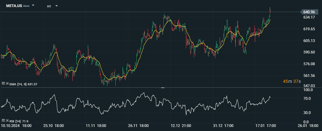 1hodinový graf zobrazující pohyb ceny Meta Platforms (META.US) od 10. října 2024 do 17. ledna 2025, analyzováno pomocí EMA (14) a RSI (14). Cena akcií stabilně roste nad EMA a dosahuje maxima 640,96 USD. RSI vrcholí na hodnotě 71,9, což naznačuje překoupené podmínky. Zdroj: xStation5