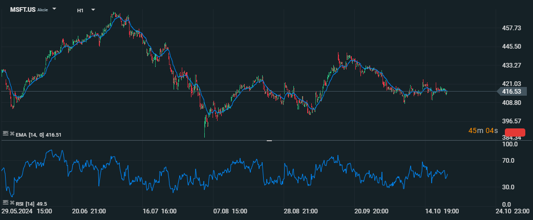 Analýza akcií Microsoftu s indikátory RSI a EMA: sledování relativní síly a trendové dynamiky pro posouzení možných překoupených nebo přeprodaných podmínek. Zdroj: xStation5