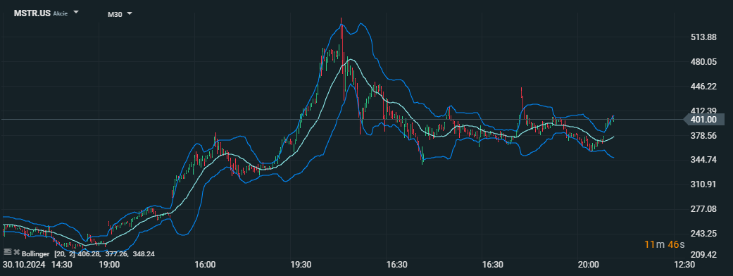 30minutový graf společnosti MicroStrategy Inc. (MSTR) – Volatilita akcií během růstu Bitcoinu a spekulací o zařazení do Nasdaq 100 (říjen–prosinec 2024). Zdroj: xStation5