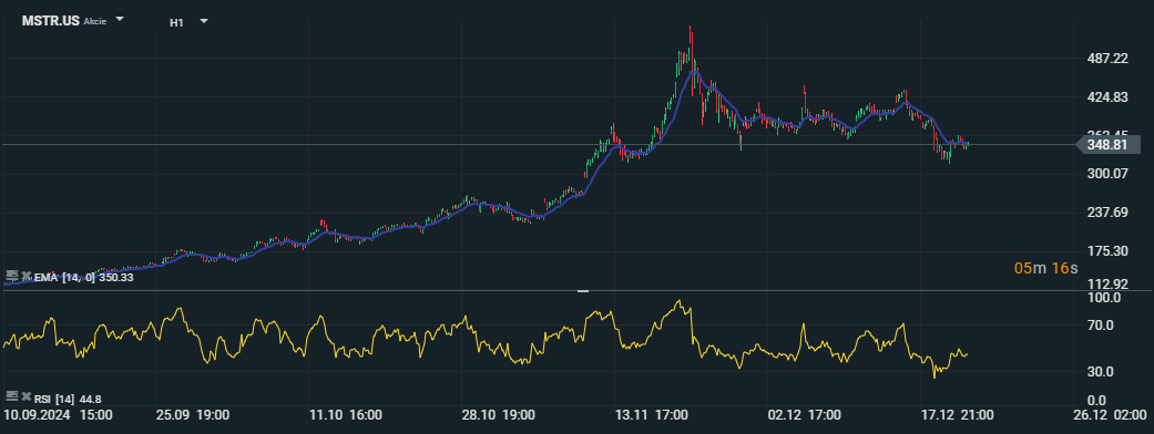 Akcie MicroStrategy uzavřely na 348,81 USD během prvního týdne po zařazení do Nasdaq-100; EMA (14) a RSI ukazují oslabení růstového trendu. Zdroj: xStation5