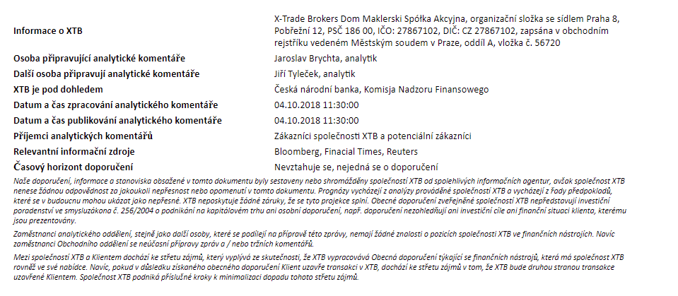 Rozdílové smlouvy jsou komplexní nástroje a v důsledku použití finanční páky jsou spojeny s vysokým rizikem rychlého vzniku finanční ztráty. U 71 % účtů retailových investorů došlo při obchodování s rozdílovými smlouvami u tohoto poskytovatele ke vzniku ztráty. Měli byste zvážit, zda rozumíte tomu, jak rozdílové smlouvy fungují, a zda si můžete dovolit vysoké riziko ztráty svých finančních prostředků. Investování je rizikové. Investujte zodpovědně. Tento materiál je marketingovou komunikací ve smyslu čl. 24 odst. 3 směrnice Evropského parlamentu a Rady 2014/65/EU ze dne 15. května 2014 o trzích finančních nástrojů, kterou se mění směrnice 2002/92/ES a směrnice 2011/61/EU (MiFID II). Marketingová komunikace není investiční doporučení ani informace doporučující či navrhující investiční strategii ve smyslu nařízení Evropského parlamentu a Rady (EU) č. 596/2014 ze dne 16. dubna 2014 o zneužívání trhu (nařízení o zneužívání trhu) a o zrušení směrnice Evropského parlamentu a Rady 2003/6/ES a směrnic Komise 2003/124/ES, 2003/125/ES a 2004/72/ES a nařízení Komise v přenesené pravomoci (EU) 2016/958 ze dne 9. března 2016, kterým se doplňuje nařízení Evropského parlamentu a Rady (EU) č. 596/2014, pokud jde o regulační technické normy pro technická ujednání pro objektivní předkládání investičních doporučení nebo jiných informací doporučujících nebo navrhujících investiční strategie a pro zveřejnění konkrétních zájmů nebo náznaků střetu zájmů nebo jakékoli jiné rady, a to i v oblasti investičního poradenství, ve smyslu zákona č. 256/2004 Sb., o podnikání na kapitálovém trhu. Marketingová komunikace je připravena s nejvyšší pečlivostí, objektivitou, prezentuje fakta známé autorovi k datu přípravy a neobsahuje žádné hodnotící prvky. Marketingová komunikace je připravena bez zohlednění potřeb klienta, jeho individuální finanční situace a nijak nepředstavuje investiční strategii. Marketingová komunikace nepředstavuje nabídku k prodeji, nabídku, předplatné, výzvu na nákup, reklamu nebo propagaci jakýchkoliv finančních nástrojů. Společnost XTB S.A., organizační složka nenese odpovědnost za jakékoli jednání nebo opomenutí klienta, zejména za získání nebo zcizení finančních nástrojů, na základě informací obsažených v této marketingové komunikaci. V případě, že marketingová komunikace obsahuje jakékoli informace o jakýchkoli výsledcích týkajících se finančních nástrojů v nich uvedených, nepředstavují žádnou záruku ani předpověď ohledně budoucích výsledků. Minulá výkonnost nemusí nutně vypovídat o budoucích výsledcích a každá osoba jednající na základě těchto informací tak činí zcela na vlastní riziko.