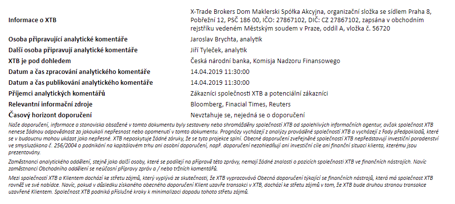 Rozdílové smlouvy jsou komplexní nástroje a v důsledku použití finanční páky jsou spojeny s vysokým rizikem rychlého vzniku finanční ztráty. U 71 % účtů retailových investorů došlo při obchodování s rozdílovými smlouvami u tohoto poskytovatele ke vzniku ztráty. Měli byste zvážit, zda rozumíte tomu, jak rozdílové smlouvy fungují, a zda si můžete dovolit vysoké riziko ztráty svých finančních prostředků. Investování je rizikové. Investujte zodpovědně. Tento materiál je marketingovou komunikací ve smyslu čl. 24 odst. 3 směrnice Evropského parlamentu a Rady 2014/65/EU ze dne 15. května 2014 o trzích finančních nástrojů, kterou se mění směrnice 2002/92/ES a směrnice 2011/61/EU (MiFID II). Marketingová komunikace není investiční doporučení ani informace doporučující či navrhující investiční strategii ve smyslu nařízení Evropského parlamentu a Rady (EU) č. 596/2014 ze dne 16. dubna 2014 o zneužívání trhu (nařízení o zneužívání trhu) a o zrušení směrnice Evropského parlamentu a Rady 2003/6/ES a směrnic Komise 2003/124/ES, 2003/125/ES a 2004/72/ES a nařízení Komise v přenesené pravomoci (EU) 2016/958 ze dne 9. března 2016, kterým se doplňuje nařízení Evropského parlamentu a Rady (EU) č. 596/2014, pokud jde o regulační technické normy pro technická ujednání pro objektivní předkládání investičních doporučení nebo jiných informací doporučujících nebo navrhujících investiční strategie a pro zveřejnění konkrétních zájmů nebo náznaků střetu zájmů nebo jakékoli jiné rady, a to i v oblasti investičního poradenství, ve smyslu zákona č. 256/2004 Sb., o podnikání na kapitálovém trhu. Marketingová komunikace je připravena s nejvyšší pečlivostí, objektivitou, prezentuje fakta známé autorovi k datu přípravy a neobsahuje žádné hodnotící prvky. Marketingová komunikace je připravena bez zohlednění potřeb klienta, jeho individuální finanční situace a nijak nepředstavuje investiční strategii. Marketingová komunikace nepředstavuje nabídku k prodeji, nabídku, předplatné, výzvu na nákup, reklamu nebo propagaci jakýchkoliv finančních nástrojů. Společnost XTB S.A., organizační složka nenese odpovědnost za jakékoli jednání nebo opomenutí klienta, zejména za získání nebo zcizení finančních nástrojů, na základě informací obsažených v této marketingové komunikaci. V případě, že marketingová komunikace obsahuje jakékoli informace o jakýchkoli výsledcích týkajících se finančních nástrojů v nich uvedených, nepředstavují žádnou záruku ani předpověď ohledně budoucích výsledků. Minulá výkonnost nemusí nutně vypovídat o budoucích výsledcích a každá osoba jednající na základě těchto informací tak činí zcela na vlastní riziko.