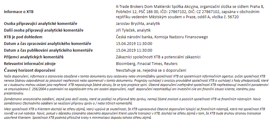 Rozdílové smlouvy jsou komplexní nástroje a v důsledku použití finanční páky jsou spojeny s vysokým rizikem rychlého vzniku finanční ztráty. U 71 % účtů retailových investorů došlo při obchodování s rozdílovými smlouvami u tohoto poskytovatele ke vzniku ztráty. Měli byste zvážit, zda rozumíte tomu, jak rozdílové smlouvy fungují, a zda si můžete dovolit vysoké riziko ztráty svých finančních prostředků. Investování je rizikové. Investujte zodpovědně. Tento materiál je marketingovou komunikací ve smyslu čl. 24 odst. 3 směrnice Evropského parlamentu a Rady 2014/65/EU ze dne 15. května 2014 o trzích finančních nástrojů, kterou se mění směrnice 2002/92/ES a směrnice 2011/61/EU (MiFID II). Marketingová komunikace není investiční doporučení ani informace doporučující či navrhující investiční strategii ve smyslu nařízení Evropského parlamentu a Rady (EU) č. 596/2014 ze dne 16. dubna 2014 o zneužívání trhu (nařízení o zneužívání trhu) a o zrušení směrnice Evropského parlamentu a Rady 2003/6/ES a směrnic Komise 2003/124/ES, 2003/125/ES a 2004/72/ES a nařízení Komise v přenesené pravomoci (EU) 2016/958 ze dne 9. března 2016, kterým se doplňuje nařízení Evropského parlamentu a Rady (EU) č. 596/2014, pokud jde o regulační technické normy pro technická ujednání pro objektivní předkládání investičních doporučení nebo jiných informací doporučujících nebo navrhujících investiční strategie a pro zveřejnění konkrétních zájmů nebo náznaků střetu zájmů nebo jakékoli jiné rady, a to i v oblasti investičního poradenství, ve smyslu zákona č. 256/2004 Sb., o podnikání na kapitálovém trhu. Marketingová komunikace je připravena s nejvyšší pečlivostí, objektivitou, prezentuje fakta známé autorovi k datu přípravy a neobsahuje žádné hodnotící prvky. Marketingová komunikace je připravena bez zohlednění potřeb klienta, jeho individuální finanční situace a nijak nepředstavuje investiční strategii. Marketingová komunikace nepředstavuje nabídku k prodeji, nabídku, předplatné, výzvu na nákup, reklamu nebo propagaci jakýchkoliv finančních nástrojů. Společnost XTB S.A., organizační složka nenese odpovědnost za jakékoli jednání nebo opomenutí klienta, zejména za získání nebo zcizení finančních nástrojů, na základě informací obsažených v této marketingové komunikaci. V případě, že marketingová komunikace obsahuje jakékoli informace o jakýchkoli výsledcích týkajících se finančních nástrojů v nich uvedených, nepředstavují žádnou záruku ani předpověď ohledně budoucích výsledků. Minulá výkonnost nemusí nutně vypovídat o budoucích výsledcích a každá osoba jednající na základě těchto informací tak činí zcela na vlastní riziko.