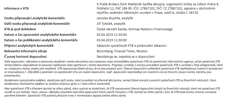 Rozdílové smlouvy jsou komplexní nástroje a v důsledku použití finanční páky jsou spojeny s vysokým rizikem rychlého vzniku finanční ztráty. U 75 % účtů retailových investorů došlo při obchodování s rozdílovými smlouvami u tohoto poskytovatele ke vzniku ztráty. Měli byste zvážit, zda rozumíte tomu, jak rozdílové smlouvy fungují, a zda si můžete dovolit vysoké riziko ztráty svých finančních prostředků. Investování je rizikové. Investujte zodpovědně. Tento materiál je marketingovou komunikací ve smyslu čl. 24 odst. 3 směrnice Evropského parlamentu a Rady 2014/65/EU ze dne 15. května 2014 o trzích finančních nástrojů, kterou se mění směrnice 2002/92/ES a směrnice 2011/61/EU (MiFID II). Marketingová komunikace není investiční doporučení ani informace doporučující či navrhující investiční strategii ve smyslu nařízení Evropského parlamentu a Rady (EU) č. 596/2014 ze dne 16. dubna 2014 o zneužívání trhu (nařízení o zneužívání trhu) a o zrušení směrnice Evropského parlamentu a Rady 2003/6/ES a směrnic Komise 2003/124/ES, 2003/125/ES a 2004/72/ES a nařízení Komise v přenesené pravomoci (EU) 2016/958 ze dne 9. března 2016, kterým se doplňuje nařízení Evropského parlamentu a Rady (EU) č. 596/2014, pokud jde o regulační technické normy pro technická ujednání pro objektivní předkládání investičních doporučení nebo jiných informací doporučujících nebo navrhujících investiční strategie a pro zveřejnění konkrétních zájmů nebo náznaků střetu zájmů nebo jakékoli jiné rady, a to i v oblasti investičního poradenství, ve smyslu zákona č. 256/2004 Sb., o podnikání na kapitálovém trhu. Marketingová komunikace je připravena s nejvyšší pečlivostí, objektivitou, prezentuje fakta známé autorovi k datu přípravy a neobsahuje žádné hodnotící prvky. Marketingová komunikace je připravena bez zohlednění potřeb klienta, jeho individuální finanční situace a nijak nepředstavuje investiční strategii. Marketingová komunikace nepředstavuje nabídku k prodeji, nabídku, předplatné, výzvu na nákup, reklamu nebo propagaci jakýchkoliv finančních nástrojů. Společnost XTB S.A., organizační složka nenese odpovědnost za jakékoli jednání nebo opomenutí klienta, zejména za získání nebo zcizení finančních nástrojů, na základě informací obsažených v této marketingové komunikaci. V případě, že marketingová komunikace obsahuje jakékoli informace o jakýchkoli výsledcích týkajících se finančních nástrojů v nich uvedených, nepředstavují žádnou záruku ani předpověď ohledně budoucích výsledků. Minulá výkonnost nemusí nutně vypovídat o budoucích výsledcích a každá osoba jednající na základě těchto informací tak činí zcela na vlastní riziko.