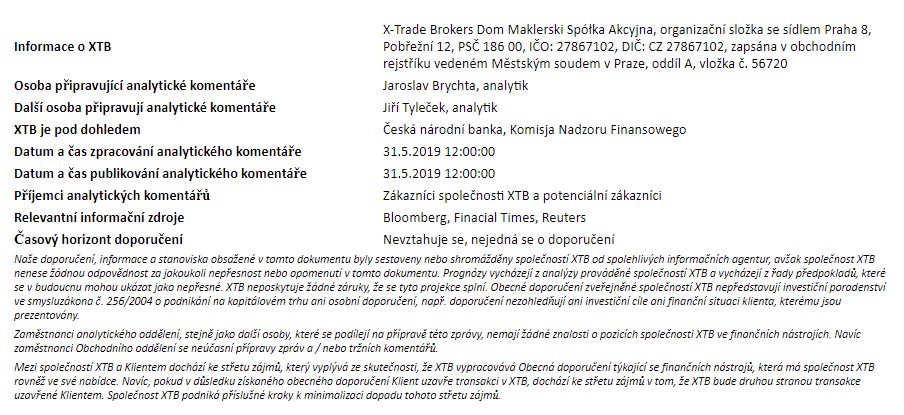 Rozdílové smlouvy jsou komplexní nástroje a v důsledku použití finanční páky jsou spojeny s vysokým rizikem rychlého vzniku finanční ztráty. U 71 % účtů retailových investorů došlo při obchodování s rozdílovými smlouvami u tohoto poskytovatele ke vzniku ztráty. Měli byste zvážit, zda rozumíte tomu, jak rozdílové smlouvy fungují, a zda si můžete dovolit vysoké riziko ztráty svých finančních prostředků. Investování je rizikové. Investujte zodpovědně. Tento materiál je marketingovou komunikací ve smyslu čl. 24 odst. 3 směrnice Evropského parlamentu a Rady 2014/65/EU ze dne 15. května 2014 o trzích finančních nástrojů, kterou se mění směrnice 2002/92/ES a směrnice 2011/61/EU (MiFID II). Marketingová komunikace není investiční doporučení ani informace doporučující či navrhující investiční strategii ve smyslu nařízení Evropského parlamentu a Rady (EU) č. 596/2014 ze dne 16. dubna 2014 o zneužívání trhu (nařízení o zneužívání trhu) a o zrušení směrnice Evropského parlamentu a Rady 2003/6/ES a směrnic Komise 2003/124/ES, 2003/125/ES a 2004/72/ES a nařízení Komise v přenesené pravomoci (EU) 2016/958 ze dne 9. března 2016, kterým se doplňuje nařízení Evropského parlamentu a Rady (EU) č. 596/2014, pokud jde o regulační technické normy pro technická ujednání pro objektivní předkládání investičních doporučení nebo jiných informací doporučujících nebo navrhujících investiční strategie a pro zveřejnění konkrétních zájmů nebo náznaků střetu zájmů nebo jakékoli jiné rady, a to i v oblasti investičního poradenství, ve smyslu zákona č. 256/2004 Sb., o podnikání na kapitálovém trhu. Marketingová komunikace je připravena s nejvyšší pečlivostí, objektivitou, prezentuje fakta známé autorovi k datu přípravy a neobsahuje žádné hodnotící prvky. Marketingová komunikace je připravena bez zohlednění potřeb klienta, jeho individuální finanční situace a nijak nepředstavuje investiční strategii. Marketingová komunikace nepředstavuje nabídku k prodeji, nabídku, předplatné, výzvu na nákup, reklamu nebo propagaci jakýchkoliv finančních nástrojů. Společnost XTB S.A., organizační složka nenese odpovědnost za jakékoli jednání nebo opomenutí klienta, zejména za získání nebo zcizení finančních nástrojů, na základě informací obsažených v této marketingové komunikaci. V případě, že marketingová komunikace obsahuje jakékoli informace o jakýchkoli výsledcích týkajících se finančních nástrojů v nich uvedených, nepředstavují žádnou záruku ani předpověď ohledně budoucích výsledků. Minulá výkonnost nemusí nutně vypovídat o budoucích výsledcích a každá osoba jednající na základě těchto informací tak činí zcela na vlastní riziko.