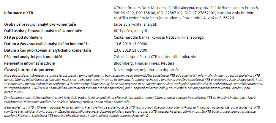 Rozdílové smlouvy jsou komplexní nástroje a v důsledku použití finanční páky jsou spojeny s vysokým rizikem rychlého vzniku finanční ztráty. U 75 % účtů retailových investorů došlo při obchodování s rozdílovými smlouvami u tohoto poskytovatele ke vzniku ztráty. Měli byste zvážit, zda rozumíte tomu, jak rozdílové smlouvy fungují, a zda si můžete dovolit vysoké riziko ztráty svých finančních prostředků. Investování je rizikové. Investujte zodpovědně. Tento materiál je marketingovou komunikací ve smyslu čl. 24 odst. 3 směrnice Evropského parlamentu a Rady 2014/65/EU ze dne 15. května 2014 o trzích finančních nástrojů, kterou se mění směrnice 2002/92/ES a směrnice 2011/61/EU (MiFID II). Marketingová komunikace není investiční doporučení ani informace doporučující či navrhující investiční strategii ve smyslu nařízení Evropského parlamentu a Rady (EU) č. 596/2014 ze dne 16. dubna 2014 o zneužívání trhu (nařízení o zneužívání trhu) a o zrušení směrnice Evropského parlamentu a Rady 2003/6/ES a směrnic Komise 2003/124/ES, 2003/125/ES a 2004/72/ES a nařízení Komise v přenesené pravomoci (EU) 2016/958 ze dne 9. března 2016, kterým se doplňuje nařízení Evropského parlamentu a Rady (EU) č. 596/2014, pokud jde o regulační technické normy pro technická ujednání pro objektivní předkládání investičních doporučení nebo jiných informací doporučujících nebo navrhujících investiční strategie a pro zveřejnění konkrétních zájmů nebo náznaků střetu zájmů nebo jakékoli jiné rady, a to i v oblasti investičního poradenství, ve smyslu zákona č. 256/2004 Sb., o podnikání na kapitálovém trhu. Marketingová komunikace je připravena s nejvyšší pečlivostí, objektivitou, prezentuje fakta známé autorovi k datu přípravy a neobsahuje žádné hodnotící prvky. Marketingová komunikace je připravena bez zohlednění potřeb klienta, jeho individuální finanční situace a nijak nepředstavuje investiční strategii. Marketingová komunikace nepředstavuje nabídku k prodeji, nabídku, předplatné, výzvu na nákup, reklamu nebo propagaci jakýchkoliv finančních nástrojů. Společnost XTB S.A., organizační složka nenese odpovědnost za jakékoli jednání nebo opomenutí klienta, zejména za získání nebo zcizení finančních nástrojů, na základě informací obsažených v této marketingové komunikaci. V případě, že marketingová komunikace obsahuje jakékoli informace o jakýchkoli výsledcích týkajících se finančních nástrojů v nich uvedených, nepředstavují žádnou záruku ani předpověď ohledně budoucích výsledků. Minulá výkonnost nemusí nutně vypovídat o budoucích výsledcích a každá osoba jednající na základě těchto informací tak činí zcela na vlastní riziko.