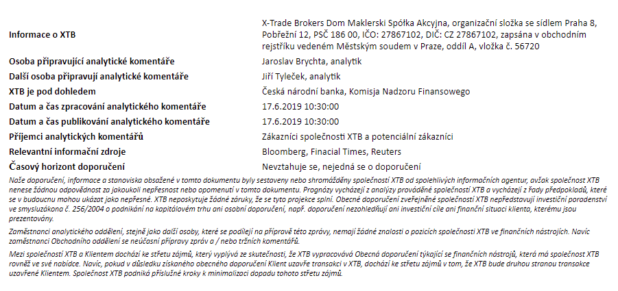 Rozdílové smlouvy jsou komplexní nástroje a v důsledku použití finanční páky jsou spojeny s vysokým rizikem rychlého vzniku finanční ztráty. U 75 % účtů retailových investorů došlo při obchodování s rozdílovými smlouvami u tohoto poskytovatele ke vzniku ztráty. Měli byste zvážit, zda rozumíte tomu, jak rozdílové smlouvy fungují, a zda si můžete dovolit vysoké riziko ztráty svých finančních prostředků. Investování je rizikové. Investujte zodpovědně. Tento materiál je marketingovou komunikací ve smyslu čl. 24 odst. 3 směrnice Evropského parlamentu a Rady 2014/65/EU ze dne 15. května 2014 o trzích finančních nástrojů, kterou se mění směrnice 2002/92/ES a směrnice 2011/61/EU (MiFID II). Marketingová komunikace není investiční doporučení ani informace doporučující či navrhující investiční strategii ve smyslu nařízení Evropského parlamentu a Rady (EU) č. 596/2014 ze dne 16. dubna 2014 o zneužívání trhu (nařízení o zneužívání trhu) a o zrušení směrnice Evropského parlamentu a Rady 2003/6/ES a směrnic Komise 2003/124/ES, 2003/125/ES a 2004/72/ES a nařízení Komise v přenesené pravomoci (EU) 2016/958 ze dne 9. března 2016, kterým se doplňuje nařízení Evropského parlamentu a Rady (EU) č. 596/2014, pokud jde o regulační technické normy pro technická ujednání pro objektivní předkládání investičních doporučení nebo jiných informací doporučujících nebo navrhujících investiční strategie a pro zveřejnění konkrétních zájmů nebo náznaků střetu zájmů nebo jakékoli jiné rady, a to i v oblasti investičního poradenství, ve smyslu zákona č. 256/2004 Sb., o podnikání na kapitálovém trhu. Marketingová komunikace je připravena s nejvyšší pečlivostí, objektivitou, prezentuje fakta známé autorovi k datu přípravy a neobsahuje žádné hodnotící prvky. Marketingová komunikace je připravena bez zohlednění potřeb klienta, jeho individuální finanční situace a nijak nepředstavuje investiční strategii. Marketingová komunikace nepředstavuje nabídku k prodeji, nabídku, předplatné, výzvu na nákup, reklamu nebo propagaci jakýchkoliv finančních nástrojů. Společnost XTB S.A., organizační složka nenese odpovědnost za jakékoli jednání nebo opomenutí klienta, zejména za získání nebo zcizení finančních nástrojů, na základě informací obsažených v této marketingové komunikaci. V případě, že marketingová komunikace obsahuje jakékoli informace o jakýchkoli výsledcích týkajících se finančních nástrojů v nich uvedených, nepředstavují žádnou záruku ani předpověď ohledně budoucích výsledků. Minulá výkonnost nemusí nutně vypovídat o budoucích výsledcích a každá osoba jednající na základě těchto informací tak činí zcela na vlastní riziko.