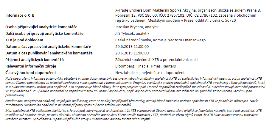Rozdílové smlouvy jsou komplexní nástroje a v důsledku použití finanční páky jsou spojeny s vysokým rizikem rychlého vzniku finanční ztráty. U 75 % účtů retailových investorů došlo při obchodování s rozdílovými smlouvami u tohoto poskytovatele ke vzniku ztráty. Měli byste zvážit, zda rozumíte tomu, jak rozdílové smlouvy fungují, a zda si můžete dovolit vysoké riziko ztráty svých finančních prostředků. Investování je rizikové. Investujte zodpovědně. Tento materiál je marketingovou komunikací ve smyslu čl. 24 odst. 3 směrnice Evropského parlamentu a Rady 2014/65/EU ze dne 15. května 2014 o trzích finančních nástrojů, kterou se mění směrnice 2002/92/ES a směrnice 2011/61/EU (MiFID II). Marketingová komunikace není investiční doporučení ani informace doporučující či navrhující investiční strategii ve smyslu nařízení Evropského parlamentu a Rady (EU) č. 596/2014 ze dne 16. dubna 2014 o zneužívání trhu (nařízení o zneužívání trhu) a o zrušení směrnice Evropského parlamentu a Rady 2003/6/ES a směrnic Komise 2003/124/ES, 2003/125/ES a 2004/72/ES a nařízení Komise v přenesené pravomoci (EU) 2016/958 ze dne 9. března 2016, kterým se doplňuje nařízení Evropského parlamentu a Rady (EU) č. 596/2014, pokud jde o regulační technické normy pro technická ujednání pro objektivní předkládání investičních doporučení nebo jiných informací doporučujících nebo navrhujících investiční strategie a pro zveřejnění konkrétních zájmů nebo náznaků střetu zájmů nebo jakékoli jiné rady, a to i v oblasti investičního poradenství, ve smyslu zákona č. 256/2004 Sb., o podnikání na kapitálovém trhu. Marketingová komunikace je připravena s nejvyšší pečlivostí, objektivitou, prezentuje fakta známé autorovi k datu přípravy a neobsahuje žádné hodnotící prvky. Marketingová komunikace je připravena bez zohlednění potřeb klienta, jeho individuální finanční situace a nijak nepředstavuje investiční strategii. Marketingová komunikace nepředstavuje nabídku k prodeji, nabídku, předplatné, výzvu na nákup, reklamu nebo propagaci jakýchkoliv finančních nástrojů. Společnost XTB S.A., organizační složka nenese odpovědnost za jakékoli jednání nebo opomenutí klienta, zejména za získání nebo zcizení finančních nástrojů, na základě informací obsažených v této marketingové komunikaci. V případě, že marketingová komunikace obsahuje jakékoli informace o jakýchkoli výsledcích týkajících se finančních nástrojů v nich uvedených, nepředstavují žádnou záruku ani předpověď ohledně budoucích výsledků. Minulá výkonnost nemusí nutně vypovídat o budoucích výsledcích a každá osoba jednající na základě těchto informací tak činí zcela na vlastní riziko.