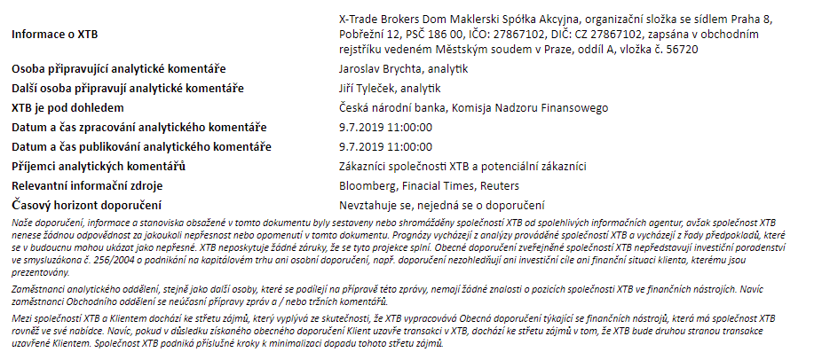 Rozdílové smlouvy jsou komplexní nástroje a v důsledku použití finanční páky jsou spojeny s vysokým rizikem rychlého vzniku finanční ztráty. U 75 % účtů retailových investorů došlo při obchodování s rozdílovými smlouvami u tohoto poskytovatele ke vzniku ztráty. Měli byste zvážit, zda rozumíte tomu, jak rozdílové smlouvy fungují, a zda si můžete dovolit vysoké riziko ztráty svých finančních prostředků. Investování je rizikové. Investujte zodpovědně. Tento materiál je marketingovou komunikací ve smyslu čl. 24 odst. 3 směrnice Evropského parlamentu a Rady 2014/65/EU ze dne 15. května 2014 o trzích finančních nástrojů, kterou se mění směrnice 2002/92/ES a směrnice 2011/61/EU (MiFID II). Marketingová komunikace není investiční doporučení ani informace doporučující či navrhující investiční strategii ve smyslu nařízení Evropského parlamentu a Rady (EU) č. 596/2014 ze dne 16. dubna 2014 o zneužívání trhu (nařízení o zneužívání trhu) a o zrušení směrnice Evropského parlamentu a Rady 2003/6/ES a směrnic Komise 2003/124/ES, 2003/125/ES a 2004/72/ES a nařízení Komise v přenesené pravomoci (EU) 2016/958 ze dne 9. března 2016, kterým se doplňuje nařízení Evropského parlamentu a Rady (EU) č. 596/2014, pokud jde o regulační technické normy pro technická ujednání pro objektivní předkládání investičních doporučení nebo jiných informací doporučujících nebo navrhujících investiční strategie a pro zveřejnění konkrétních zájmů nebo náznaků střetu zájmů nebo jakékoli jiné rady, a to i v oblasti investičního poradenství, ve smyslu zákona č. 256/2004 Sb., o podnikání na kapitálovém trhu. Marketingová komunikace je připravena s nejvyšší pečlivostí, objektivitou, prezentuje fakta známé autorovi k datu přípravy a neobsahuje žádné hodnotící prvky. Marketingová komunikace je připravena bez zohlednění potřeb klienta, jeho individuální finanční situace a nijak nepředstavuje investiční strategii. Marketingová komunikace nepředstavuje nabídku k prodeji, nabídku, předplatné, výzvu na nákup, reklamu nebo propagaci jakýchkoliv finančních nástrojů. Společnost XTB S.A., organizační složka nenese odpovědnost za jakékoli jednání nebo opomenutí klienta, zejména za získání nebo zcizení finančních nástrojů, na základě informací obsažených v této marketingové komunikaci. V případě, že marketingová komunikace obsahuje jakékoli informace o jakýchkoli výsledcích týkajících se finančních nástrojů v nich uvedených, nepředstavují žádnou záruku ani předpověď ohledně budoucích výsledků. Minulá výkonnost nemusí nutně vypovídat o budoucích výsledcích a každá osoba jednající na základě těchto informací tak činí zcela na vlastní riziko.