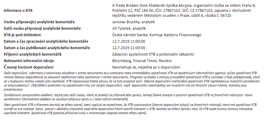 Rozdílové smlouvy jsou komplexní nástroje a v důsledku použití finanční páky jsou spojeny s vysokým rizikem rychlého vzniku finanční ztráty. U 75 % účtů retailových investorů došlo při obchodování s rozdílovými smlouvami u tohoto poskytovatele ke vzniku ztráty. Měli byste zvážit, zda rozumíte tomu, jak rozdílové smlouvy fungují, a zda si můžete dovolit vysoké riziko ztráty svých finančních prostředků. Investování je rizikové. Investujte zodpovědně. Tento materiál je marketingovou komunikací ve smyslu čl. 24 odst. 3 směrnice Evropského parlamentu a Rady 2014/65/EU ze dne 15. května 2014 o trzích finančních nástrojů, kterou se mění směrnice 2002/92/ES a směrnice 2011/61/EU (MiFID II). Marketingová komunikace není investiční doporučení ani informace doporučující či navrhující investiční strategii ve smyslu nařízení Evropského parlamentu a Rady (EU) č. 596/2014 ze dne 16. dubna 2014 o zneužívání trhu (nařízení o zneužívání trhu) a o zrušení směrnice Evropského parlamentu a Rady 2003/6/ES a směrnic Komise 2003/124/ES, 2003/125/ES a 2004/72/ES a nařízení Komise v přenesené pravomoci (EU) 2016/958 ze dne 9. března 2016, kterým se doplňuje nařízení Evropského parlamentu a Rady (EU) č. 596/2014, pokud jde o regulační technické normy pro technická ujednání pro objektivní předkládání investičních doporučení nebo jiných informací doporučujících nebo navrhujících investiční strategie a pro zveřejnění konkrétních zájmů nebo náznaků střetu zájmů nebo jakékoli jiné rady, a to i v oblasti investičního poradenství, ve smyslu zákona č. 256/2004 Sb., o podnikání na kapitálovém trhu. Marketingová komunikace je připravena s nejvyšší pečlivostí, objektivitou, prezentuje fakta známé autorovi k datu přípravy a neobsahuje žádné hodnotící prvky. Marketingová komunikace je připravena bez zohlednění potřeb klienta, jeho individuální finanční situace a nijak nepředstavuje investiční strategii. Marketingová komunikace nepředstavuje nabídku k prodeji, nabídku, předplatné, výzvu na nákup, reklamu nebo propagaci jakýchkoliv finančních nástrojů. Společnost XTB S.A., organizační složka nenese odpovědnost za jakékoli jednání nebo opomenutí klienta, zejména za získání nebo zcizení finančních nástrojů, na základě informací obsažených v této marketingové komunikaci. V případě, že marketingová komunikace obsahuje jakékoli informace o jakýchkoli výsledcích týkajících se finančních nástrojů v nich uvedených, nepředstavují žádnou záruku ani předpověď ohledně budoucích výsledků. Minulá výkonnost nemusí nutně vypovídat o budoucích výsledcích a každá osoba jednající na základě těchto informací tak činí zcela na vlastní riziko.