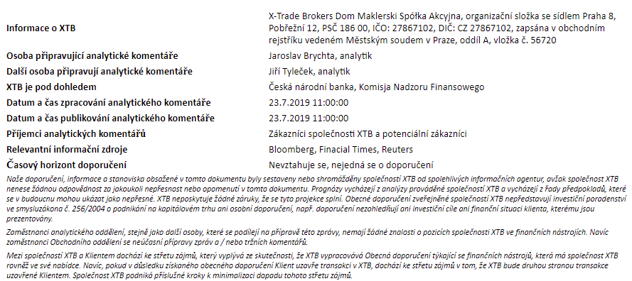 Rozdílové smlouvy jsou komplexní nástroje a v důsledku použití finanční páky jsou spojeny s vysokým rizikem rychlého vzniku finanční ztráty. U 75 % účtů retailových investorů došlo při obchodování s rozdílovými smlouvami u tohoto poskytovatele ke vzniku ztráty. Měli byste zvážit, zda rozumíte tomu, jak rozdílové smlouvy fungují, a zda si můžete dovolit vysoké riziko ztráty svých finančních prostředků. Investování je rizikové. Investujte zodpovědně. Tento materiál je marketingovou komunikací ve smyslu čl. 24 odst. 3 směrnice Evropského parlamentu a Rady 2014/65/EU ze dne 15. května 2014 o trzích finančních nástrojů, kterou se mění směrnice 2002/92/ES a směrnice 2011/61/EU (MiFID II). Marketingová komunikace není investiční doporučení ani informace doporučující či navrhující investiční strategii ve smyslu nařízení Evropského parlamentu a Rady (EU) č. 596/2014 ze dne 16. dubna 2014 o zneužívání trhu (nařízení o zneužívání trhu) a o zrušení směrnice Evropského parlamentu a Rady 2003/6/ES a směrnic Komise 2003/124/ES, 2003/125/ES a 2004/72/ES a nařízení Komise v přenesené pravomoci (EU) 2016/958 ze dne 9. března 2016, kterým se doplňuje nařízení Evropského parlamentu a Rady (EU) č. 596/2014, pokud jde o regulační technické normy pro technická ujednání pro objektivní předkládání investičních doporučení nebo jiných informací doporučujících nebo navrhujících investiční strategie a pro zveřejnění konkrétních zájmů nebo náznaků střetu zájmů nebo jakékoli jiné rady, a to i v oblasti investičního poradenství, ve smyslu zákona č. 256/2004 Sb., o podnikání na kapitálovém trhu. Marketingová komunikace je připravena s nejvyšší pečlivostí, objektivitou, prezentuje fakta známé autorovi k datu přípravy a neobsahuje žádné hodnotící prvky. Marketingová komunikace je připravena bez zohlednění potřeb klienta, jeho individuální finanční situace a nijak nepředstavuje investiční strategii. Marketingová komunikace nepředstavuje nabídku k prodeji, nabídku, předplatné, výzvu na nákup, reklamu nebo propagaci jakýchkoliv finančních nástrojů. Společnost XTB S.A., organizační složka nenese odpovědnost za jakékoli jednání nebo opomenutí klienta, zejména za získání nebo zcizení finančních nástrojů, na základě informací obsažených v této marketingové komunikaci. V případě, že marketingová komunikace obsahuje jakékoli informace o jakýchkoli výsledcích týkajících se finančních nástrojů v nich uvedených, nepředstavují žádnou záruku ani předpověď ohledně budoucích výsledků. Minulá výkonnost nemusí nutně vypovídat o budoucích výsledcích a každá osoba jednající na základě těchto informací tak činí zcela na vlastní riziko.