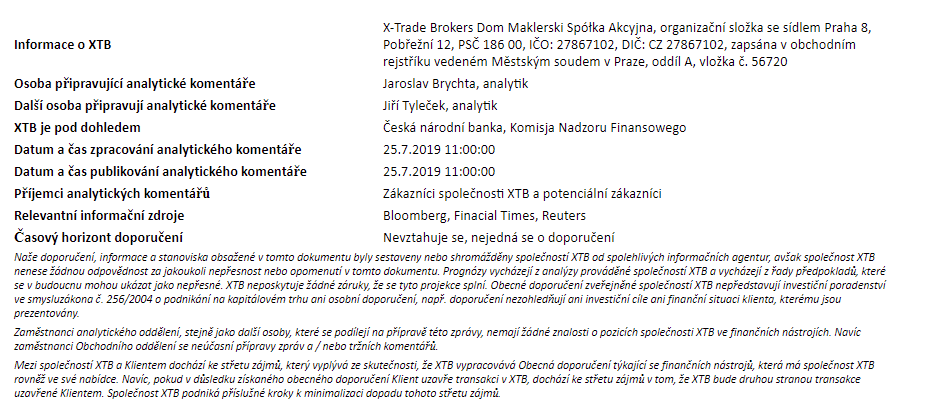 Rozdílové smlouvy jsou komplexní nástroje a v důsledku použití finanční páky jsou spojeny s vysokým rizikem rychlého vzniku finanční ztráty. U 71 % účtů retailových investorů došlo při obchodování s rozdílovými smlouvami u tohoto poskytovatele ke vzniku ztráty. Měli byste zvážit, zda rozumíte tomu, jak rozdílové smlouvy fungují, a zda si můžete dovolit vysoké riziko ztráty svých finančních prostředků. Investování je rizikové. Investujte zodpovědně. Tento materiál je marketingovou komunikací ve smyslu čl. 24 odst. 3 směrnice Evropského parlamentu a Rady 2014/65/EU ze dne 15. května 2014 o trzích finančních nástrojů, kterou se mění směrnice 2002/92/ES a směrnice 2011/61/EU (MiFID II). Marketingová komunikace není investiční doporučení ani informace doporučující či navrhující investiční strategii ve smyslu nařízení Evropského parlamentu a Rady (EU) č. 596/2014 ze dne 16. dubna 2014 o zneužívání trhu (nařízení o zneužívání trhu) a o zrušení směrnice Evropského parlamentu a Rady 2003/6/ES a směrnic Komise 2003/124/ES, 2003/125/ES a 2004/72/ES a nařízení Komise v přenesené pravomoci (EU) 2016/958 ze dne 9. března 2016, kterým se doplňuje nařízení Evropského parlamentu a Rady (EU) č. 596/2014, pokud jde o regulační technické normy pro technická ujednání pro objektivní předkládání investičních doporučení nebo jiných informací doporučujících nebo navrhujících investiční strategie a pro zveřejnění konkrétních zájmů nebo náznaků střetu zájmů nebo jakékoli jiné rady, a to i v oblasti investičního poradenství, ve smyslu zákona č. 256/2004 Sb., o podnikání na kapitálovém trhu. Marketingová komunikace je připravena s nejvyšší pečlivostí, objektivitou, prezentuje fakta známé autorovi k datu přípravy a neobsahuje žádné hodnotící prvky. Marketingová komunikace je připravena bez zohlednění potřeb klienta, jeho individuální finanční situace a nijak nepředstavuje investiční strategii. Marketingová komunikace nepředstavuje nabídku k prodeji, nabídku, předplatné, výzvu na nákup, reklamu nebo propagaci jakýchkoliv finančních nástrojů. Společnost XTB S.A., organizační složka nenese odpovědnost za jakékoli jednání nebo opomenutí klienta, zejména za získání nebo zcizení finančních nástrojů, na základě informací obsažených v této marketingové komunikaci. V případě, že marketingová komunikace obsahuje jakékoli informace o jakýchkoli výsledcích týkajících se finančních nástrojů v nich uvedených, nepředstavují žádnou záruku ani předpověď ohledně budoucích výsledků. Minulá výkonnost nemusí nutně vypovídat o budoucích výsledcích a každá osoba jednající na základě těchto informací tak činí zcela na vlastní riziko.