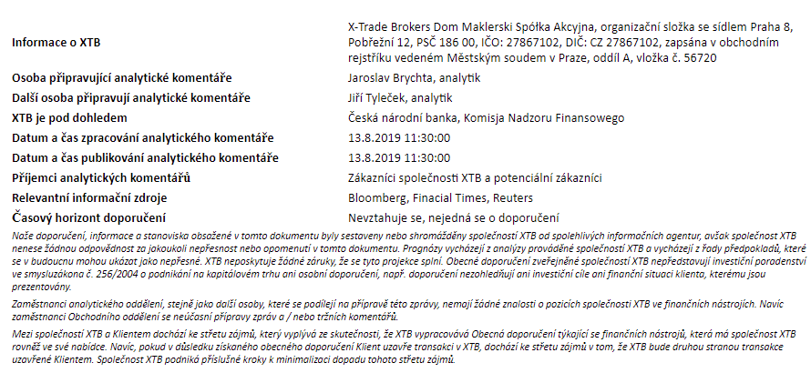 Rozdílové smlouvy jsou komplexní nástroje a v důsledku použití finanční páky jsou spojeny s vysokým rizikem rychlého vzniku finanční ztráty. U 71 % účtů retailových investorů došlo při obchodování s rozdílovými smlouvami u tohoto poskytovatele ke vzniku ztráty. Měli byste zvážit, zda rozumíte tomu, jak rozdílové smlouvy fungují, a zda si můžete dovolit vysoké riziko ztráty svých finančních prostředků. Investování je rizikové. Investujte zodpovědně. Tento materiál je marketingovou komunikací ve smyslu čl. 24 odst. 3 směrnice Evropského parlamentu a Rady 2014/65/EU ze dne 15. května 2014 o trzích finančních nástrojů, kterou se mění směrnice 2002/92/ES a směrnice 2011/61/EU (MiFID II). Marketingová komunikace není investiční doporučení ani informace doporučující či navrhující investiční strategii ve smyslu nařízení Evropského parlamentu a Rady (EU) č. 596/2014 ze dne 16. dubna 2014 o zneužívání trhu (nařízení o zneužívání trhu) a o zrušení směrnice Evropského parlamentu a Rady 2003/6/ES a směrnic Komise 2003/124/ES, 2003/125/ES a 2004/72/ES a nařízení Komise v přenesené pravomoci (EU) 2016/958 ze dne 9. března 2016, kterým se doplňuje nařízení Evropského parlamentu a Rady (EU) č. 596/2014, pokud jde o regulační technické normy pro technická ujednání pro objektivní předkládání investičních doporučení nebo jiných informací doporučujících nebo navrhujících investiční strategie a pro zveřejnění konkrétních zájmů nebo náznaků střetu zájmů nebo jakékoli jiné rady, a to i v oblasti investičního poradenství, ve smyslu zákona č. 256/2004 Sb., o podnikání na kapitálovém trhu. Marketingová komunikace je připravena s nejvyšší pečlivostí, objektivitou, prezentuje fakta známé autorovi k datu přípravy a neobsahuje žádné hodnotící prvky. Marketingová komunikace je připravena bez zohlednění potřeb klienta, jeho individuální finanční situace a nijak nepředstavuje investiční strategii. Marketingová komunikace nepředstavuje nabídku k prodeji, nabídku, předplatné, výzvu na nákup, reklamu nebo propagaci jakýchkoliv finančních nástrojů. Společnost XTB S.A., organizační složka nenese odpovědnost za jakékoli jednání nebo opomenutí klienta, zejména za získání nebo zcizení finančních nástrojů, na základě informací obsažených v této marketingové komunikaci. V případě, že marketingová komunikace obsahuje jakékoli informace o jakýchkoli výsledcích týkajících se finančních nástrojů v nich uvedených, nepředstavují žádnou záruku ani předpověď ohledně budoucích výsledků. Minulá výkonnost nemusí nutně vypovídat o budoucích výsledcích a každá osoba jednající na základě těchto informací tak činí zcela na vlastní riziko.