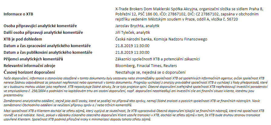 Rozdílové smlouvy jsou komplexní nástroje a v důsledku použití finanční páky jsou spojeny s vysokým rizikem rychlého vzniku finanční ztráty. U 75 % účtů retailových investorů došlo při obchodování s rozdílovými smlouvami u tohoto poskytovatele ke vzniku ztráty. Měli byste zvážit, zda rozumíte tomu, jak rozdílové smlouvy fungují, a zda si můžete dovolit vysoké riziko ztráty svých finančních prostředků. Investování je rizikové. Investujte zodpovědně. Tento materiál je marketingovou komunikací ve smyslu čl. 24 odst. 3 směrnice Evropského parlamentu a Rady 2014/65/EU ze dne 15. května 2014 o trzích finančních nástrojů, kterou se mění směrnice 2002/92/ES a směrnice 2011/61/EU (MiFID II). Marketingová komunikace není investiční doporučení ani informace doporučující či navrhující investiční strategii ve smyslu nařízení Evropského parlamentu a Rady (EU) č. 596/2014 ze dne 16. dubna 2014 o zneužívání trhu (nařízení o zneužívání trhu) a o zrušení směrnice Evropského parlamentu a Rady 2003/6/ES a směrnic Komise 2003/124/ES, 2003/125/ES a 2004/72/ES a nařízení Komise v přenesené pravomoci (EU) 2016/958 ze dne 9. března 2016, kterým se doplňuje nařízení Evropského parlamentu a Rady (EU) č. 596/2014, pokud jde o regulační technické normy pro technická ujednání pro objektivní předkládání investičních doporučení nebo jiných informací doporučujících nebo navrhujících investiční strategie a pro zveřejnění konkrétních zájmů nebo náznaků střetu zájmů nebo jakékoli jiné rady, a to i v oblasti investičního poradenství, ve smyslu zákona č. 256/2004 Sb., o podnikání na kapitálovém trhu. Marketingová komunikace je připravena s nejvyšší pečlivostí, objektivitou, prezentuje fakta známé autorovi k datu přípravy a neobsahuje žádné hodnotící prvky. Marketingová komunikace je připravena bez zohlednění potřeb klienta, jeho individuální finanční situace a nijak nepředstavuje investiční strategii. Marketingová komunikace nepředstavuje nabídku k prodeji, nabídku, předplatné, výzvu na nákup, reklamu nebo propagaci jakýchkoliv finančních nástrojů. Společnost XTB S.A., organizační složka nenese odpovědnost za jakékoli jednání nebo opomenutí klienta, zejména za získání nebo zcizení finančních nástrojů, na základě informací obsažených v této marketingové komunikaci. V případě, že marketingová komunikace obsahuje jakékoli informace o jakýchkoli výsledcích týkajících se finančních nástrojů v nich uvedených, nepředstavují žádnou záruku ani předpověď ohledně budoucích výsledků. Minulá výkonnost nemusí nutně vypovídat o budoucích výsledcích a každá osoba jednající na základě těchto informací tak činí zcela na vlastní riziko.