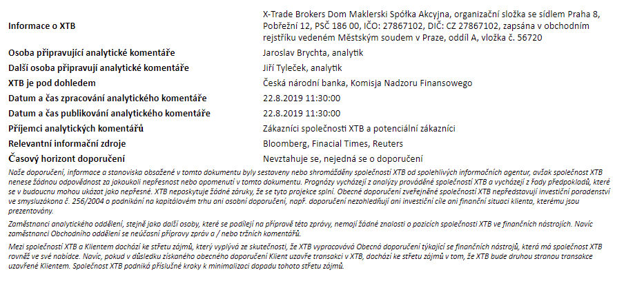Rozdílové smlouvy jsou komplexní nástroje a v důsledku použití finanční páky jsou spojeny s vysokým rizikem rychlého vzniku finanční ztráty. U 75 % účtů retailových investorů došlo při obchodování s rozdílovými smlouvami u tohoto poskytovatele ke vzniku ztráty. Měli byste zvážit, zda rozumíte tomu, jak rozdílové smlouvy fungují, a zda si můžete dovolit vysoké riziko ztráty svých finančních prostředků. Investování je rizikové. Investujte zodpovědně. Tento materiál je marketingovou komunikací ve smyslu čl. 24 odst. 3 směrnice Evropského parlamentu a Rady 2014/65/EU ze dne 15. května 2014 o trzích finančních nástrojů, kterou se mění směrnice 2002/92/ES a směrnice 2011/61/EU (MiFID II). Marketingová komunikace není investiční doporučení ani informace doporučující či navrhující investiční strategii ve smyslu nařízení Evropského parlamentu a Rady (EU) č. 596/2014 ze dne 16. dubna 2014 o zneužívání trhu (nařízení o zneužívání trhu) a o zrušení směrnice Evropského parlamentu a Rady 2003/6/ES a směrnic Komise 2003/124/ES, 2003/125/ES a 2004/72/ES a nařízení Komise v přenesené pravomoci (EU) 2016/958 ze dne 9. března 2016, kterým se doplňuje nařízení Evropského parlamentu a Rady (EU) č. 596/2014, pokud jde o regulační technické normy pro technická ujednání pro objektivní předkládání investičních doporučení nebo jiných informací doporučujících nebo navrhujících investiční strategie a pro zveřejnění konkrétních zájmů nebo náznaků střetu zájmů nebo jakékoli jiné rady, a to i v oblasti investičního poradenství, ve smyslu zákona č. 256/2004 Sb., o podnikání na kapitálovém trhu. Marketingová komunikace je připravena s nejvyšší pečlivostí, objektivitou, prezentuje fakta známé autorovi k datu přípravy a neobsahuje žádné hodnotící prvky. Marketingová komunikace je připravena bez zohlednění potřeb klienta, jeho individuální finanční situace a nijak nepředstavuje investiční strategii. Marketingová komunikace nepředstavuje nabídku k prodeji, nabídku, předplatné, výzvu na nákup, reklamu nebo propagaci jakýchkoliv finančních nástrojů. Společnost XTB S.A., organizační složka nenese odpovědnost za jakékoli jednání nebo opomenutí klienta, zejména za získání nebo zcizení finančních nástrojů, na základě informací obsažených v této marketingové komunikaci. V případě, že marketingová komunikace obsahuje jakékoli informace o jakýchkoli výsledcích týkajících se finančních nástrojů v nich uvedených, nepředstavují žádnou záruku ani předpověď ohledně budoucích výsledků. Minulá výkonnost nemusí nutně vypovídat o budoucích výsledcích a každá osoba jednající na základě těchto informací tak činí zcela na vlastní riziko.