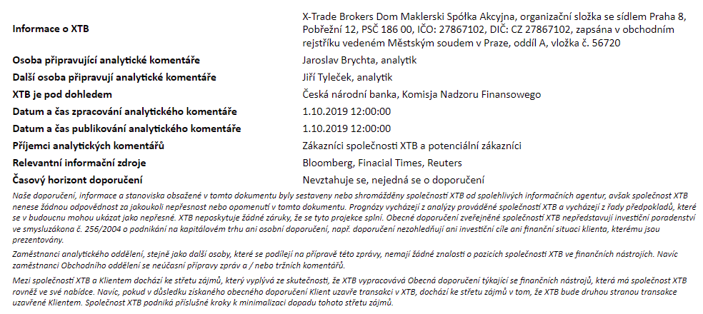 Rozdílové smlouvy jsou komplexní nástroje a v důsledku použití finanční páky jsou spojeny s vysokým rizikem rychlého vzniku finanční ztráty. U 75 % účtů retailových investorů došlo při obchodování s rozdílovými smlouvami u tohoto poskytovatele ke vzniku ztráty. Měli byste zvážit, zda rozumíte tomu, jak rozdílové smlouvy fungují, a zda si můžete dovolit vysoké riziko ztráty svých finančních prostředků. Investování je rizikové. Investujte zodpovědně. Tento materiál je marketingovou komunikací ve smyslu čl. 24 odst. 3 směrnice Evropského parlamentu a Rady 2014/65/EU ze dne 15. května 2014 o trzích finančních nástrojů, kterou se mění směrnice 2002/92/ES a směrnice 2011/61/EU (MiFID II). Marketingová komunikace není investiční doporučení ani informace doporučující či navrhující investiční strategii ve smyslu nařízení Evropského parlamentu a Rady (EU) č. 596/2014 ze dne 16. dubna 2014 o zneužívání trhu (nařízení o zneužívání trhu) a o zrušení směrnice Evropského parlamentu a Rady 2003/6/ES a směrnic Komise 2003/124/ES, 2003/125/ES a 2004/72/ES a nařízení Komise v přenesené pravomoci (EU) 2016/958 ze dne 9. března 2016, kterým se doplňuje nařízení Evropského parlamentu a Rady (EU) č. 596/2014, pokud jde o regulační technické normy pro technická ujednání pro objektivní předkládání investičních doporučení nebo jiných informací doporučujících nebo navrhujících investiční strategie a pro zveřejnění konkrétních zájmů nebo náznaků střetu zájmů nebo jakékoli jiné rady, a to i v oblasti investičního poradenství, ve smyslu zákona č. 256/2004 Sb., o podnikání na kapitálovém trhu. Marketingová komunikace je připravena s nejvyšší pečlivostí, objektivitou, prezentuje fakta známé autorovi k datu přípravy a neobsahuje žádné hodnotící prvky. Marketingová komunikace je připravena bez zohlednění potřeb klienta, jeho individuální finanční situace a nijak nepředstavuje investiční strategii. Marketingová komunikace nepředstavuje nabídku k prodeji, nabídku, předplatné, výzvu na nákup, reklamu nebo propagaci jakýchkoliv finančních nástrojů. Společnost XTB S.A., organizační složka nenese odpovědnost za jakékoli jednání nebo opomenutí klienta, zejména za získání nebo zcizení finančních nástrojů, na základě informací obsažených v této marketingové komunikaci. V případě, že marketingová komunikace obsahuje jakékoli informace o jakýchkoli výsledcích týkajících se finančních nástrojů v nich uvedených, nepředstavují žádnou záruku ani předpověď ohledně budoucích výsledků. Minulá výkonnost nemusí nutně vypovídat o budoucích výsledcích a každá osoba jednající na základě těchto informací tak činí zcela na vlastní riziko.