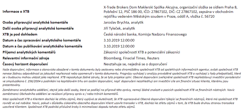 Rozdílové smlouvy jsou komplexní nástroje a v důsledku použití finanční páky jsou spojeny s vysokým rizikem rychlého vzniku finanční ztráty. U 75 % účtů retailových investorů došlo při obchodování s rozdílovými smlouvami u tohoto poskytovatele ke vzniku ztráty. Měli byste zvážit, zda rozumíte tomu, jak rozdílové smlouvy fungují, a zda si můžete dovolit vysoké riziko ztráty svých finančních prostředků. Investování je rizikové. Investujte zodpovědně. Tento materiál je marketingovou komunikací ve smyslu čl. 24 odst. 3 směrnice Evropského parlamentu a Rady 2014/65/EU ze dne 15. května 2014 o trzích finančních nástrojů, kterou se mění směrnice 2002/92/ES a směrnice 2011/61/EU (MiFID II). Marketingová komunikace není investiční doporučení ani informace doporučující či navrhující investiční strategii ve smyslu nařízení Evropského parlamentu a Rady (EU) č. 596/2014 ze dne 16. dubna 2014 o zneužívání trhu (nařízení o zneužívání trhu) a o zrušení směrnice Evropského parlamentu a Rady 2003/6/ES a směrnic Komise 2003/124/ES, 2003/125/ES a 2004/72/ES a nařízení Komise v přenesené pravomoci (EU) 2016/958 ze dne 9. března 2016, kterým se doplňuje nařízení Evropského parlamentu a Rady (EU) č. 596/2014, pokud jde o regulační technické normy pro technická ujednání pro objektivní předkládání investičních doporučení nebo jiných informací doporučujících nebo navrhujících investiční strategie a pro zveřejnění konkrétních zájmů nebo náznaků střetu zájmů nebo jakékoli jiné rady, a to i v oblasti investičního poradenství, ve smyslu zákona č. 256/2004 Sb., o podnikání na kapitálovém trhu. Marketingová komunikace je připravena s nejvyšší pečlivostí, objektivitou, prezentuje fakta známé autorovi k datu přípravy a neobsahuje žádné hodnotící prvky. Marketingová komunikace je připravena bez zohlednění potřeb klienta, jeho individuální finanční situace a nijak nepředstavuje investiční strategii. Marketingová komunikace nepředstavuje nabídku k prodeji, nabídku, předplatné, výzvu na nákup, reklamu nebo propagaci jakýchkoliv finančních nástrojů. Společnost XTB S.A., organizační složka nenese odpovědnost za jakékoli jednání nebo opomenutí klienta, zejména za získání nebo zcizení finančních nástrojů, na základě informací obsažených v této marketingové komunikaci. V případě, že marketingová komunikace obsahuje jakékoli informace o jakýchkoli výsledcích týkajících se finančních nástrojů v nich uvedených, nepředstavují žádnou záruku ani předpověď ohledně budoucích výsledků. Minulá výkonnost nemusí nutně vypovídat o budoucích výsledcích a každá osoba jednající na základě těchto informací tak činí zcela na vlastní riziko.