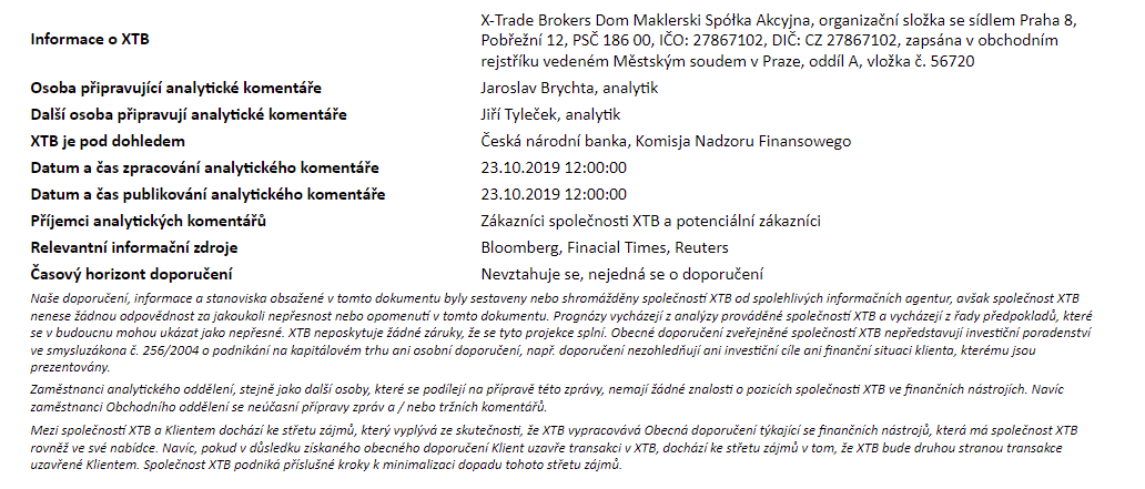 Rozdílové smlouvy jsou komplexní nástroje a v důsledku použití finanční páky jsou spojeny s vysokým rizikem rychlého vzniku finanční ztráty. U 75 % účtů retailových investorů došlo při obchodování s rozdílovými smlouvami u tohoto poskytovatele ke vzniku ztráty. Měli byste zvážit, zda rozumíte tomu, jak rozdílové smlouvy fungují, a zda si můžete dovolit vysoké riziko ztráty svých finančních prostředků. Investování je rizikové. Investujte zodpovědně. Tento materiál je marketingovou komunikací ve smyslu čl. 24 odst. 3 směrnice Evropského parlamentu a Rady 2014/65/EU ze dne 15. května 2014 o trzích finančních nástrojů, kterou se mění směrnice 2002/92/ES a směrnice 2011/61/EU (MiFID II). Marketingová komunikace není investiční doporučení ani informace doporučující či navrhující investiční strategii ve smyslu nařízení Evropského parlamentu a Rady (EU) č. 596/2014 ze dne 16. dubna 2014 o zneužívání trhu (nařízení o zneužívání trhu) a o zrušení směrnice Evropského parlamentu a Rady 2003/6/ES a směrnic Komise 2003/124/ES, 2003/125/ES a 2004/72/ES a nařízení Komise v přenesené pravomoci (EU) 2016/958 ze dne 9. března 2016, kterým se doplňuje nařízení Evropského parlamentu a Rady (EU) č. 596/2014, pokud jde o regulační technické normy pro technická ujednání pro objektivní předkládání investičních doporučení nebo jiných informací doporučujících nebo navrhujících investiční strategie a pro zveřejnění konkrétních zájmů nebo náznaků střetu zájmů nebo jakékoli jiné rady, a to i v oblasti investičního poradenství, ve smyslu zákona č. 256/2004 Sb., o podnikání na kapitálovém trhu. Marketingová komunikace je připravena s nejvyšší pečlivostí, objektivitou, prezentuje fakta známé autorovi k datu přípravy a neobsahuje žádné hodnotící prvky. Marketingová komunikace je připravena bez zohlednění potřeb klienta, jeho individuální finanční situace a nijak nepředstavuje investiční strategii. Marketingová komunikace nepředstavuje nabídku k prodeji, nabídku, předplatné, výzvu na nákup, reklamu nebo propagaci jakýchkoliv finančních nástrojů. Společnost XTB S.A., organizační složka nenese odpovědnost za jakékoli jednání nebo opomenutí klienta, zejména za získání nebo zcizení finančních nástrojů, na základě informací obsažených v této marketingové komunikaci. V případě, že marketingová komunikace obsahuje jakékoli informace o jakýchkoli výsledcích týkajících se finančních nástrojů v nich uvedených, nepředstavují žádnou záruku ani předpověď ohledně budoucích výsledků. Minulá výkonnost nemusí nutně vypovídat o budoucích výsledcích a každá osoba jednající na základě těchto informací tak činí zcela na vlastní riziko.