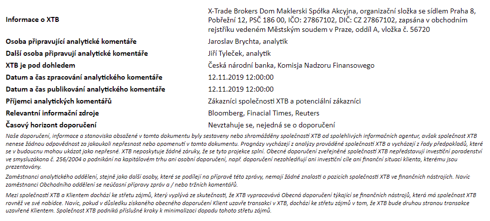 Rozdílové smlouvy jsou komplexní nástroje a v důsledku použití finanční páky jsou spojeny s vysokým rizikem rychlého vzniku finanční ztráty. U 75 % účtů retailových investorů došlo při obchodování s rozdílovými smlouvami u tohoto poskytovatele ke vzniku ztráty. Měli byste zvážit, zda rozumíte tomu, jak rozdílové smlouvy fungují, a zda si můžete dovolit vysoké riziko ztráty svých finančních prostředků. Investování je rizikové. Investujte zodpovědně. Tento materiál je marketingovou komunikací ve smyslu čl. 24 odst. 3 směrnice Evropského parlamentu a Rady 2014/65/EU ze dne 15. května 2014 o trzích finančních nástrojů, kterou se mění směrnice 2002/92/ES a směrnice 2011/61/EU (MiFID II). Marketingová komunikace není investiční doporučení ani informace doporučující či navrhující investiční strategii ve smyslu nařízení Evropského parlamentu a Rady (EU) č. 596/2014 ze dne 16. dubna 2014 o zneužívání trhu (nařízení o zneužívání trhu) a o zrušení směrnice Evropského parlamentu a Rady 2003/6/ES a směrnic Komise 2003/124/ES, 2003/125/ES a 2004/72/ES a nařízení Komise v přenesené pravomoci (EU) 2016/958 ze dne 9. března 2016, kterým se doplňuje nařízení Evropského parlamentu a Rady (EU) č. 596/2014, pokud jde o regulační technické normy pro technická ujednání pro objektivní předkládání investičních doporučení nebo jiných informací doporučujících nebo navrhujících investiční strategie a pro zveřejnění konkrétních zájmů nebo náznaků střetu zájmů nebo jakékoli jiné rady, a to i v oblasti investičního poradenství, ve smyslu zákona č. 256/2004 Sb., o podnikání na kapitálovém trhu. Marketingová komunikace je připravena s nejvyšší pečlivostí, objektivitou, prezentuje fakta známé autorovi k datu přípravy a neobsahuje žádné hodnotící prvky. Marketingová komunikace je připravena bez zohlednění potřeb klienta, jeho individuální finanční situace a nijak nepředstavuje investiční strategii. Marketingová komunikace nepředstavuje nabídku k prodeji, nabídku, předplatné, výzvu na nákup, reklamu nebo propagaci jakýchkoliv finančních nástrojů. Společnost XTB S.A., organizační složka nenese odpovědnost za jakékoli jednání nebo opomenutí klienta, zejména za získání nebo zcizení finančních nástrojů, na základě informací obsažených v této marketingové komunikaci. V případě, že marketingová komunikace obsahuje jakékoli informace o jakýchkoli výsledcích týkajících se finančních nástrojů v nich uvedených, nepředstavují žádnou záruku ani předpověď ohledně budoucích výsledků. Minulá výkonnost nemusí nutně vypovídat o budoucích výsledcích a každá osoba jednající na základě těchto informací tak činí zcela na vlastní riziko.