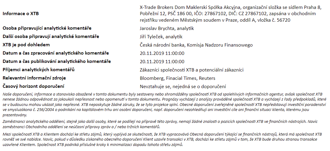 Rozdílové smlouvy jsou komplexní nástroje a v důsledku použití finanční páky jsou spojeny s vysokým rizikem rychlého vzniku finanční ztráty. U 75 % účtů retailových investorů došlo při obchodování s rozdílovými smlouvami u tohoto poskytovatele ke vzniku ztráty. Měli byste zvážit, zda rozumíte tomu, jak rozdílové smlouvy fungují, a zda si můžete dovolit vysoké riziko ztráty svých finančních prostředků. Investování je rizikové. Investujte zodpovědně. Tento materiál je marketingovou komunikací ve smyslu čl. 24 odst. 3 směrnice Evropského parlamentu a Rady 2014/65/EU ze dne 15. května 2014 o trzích finančních nástrojů, kterou se mění směrnice 2002/92/ES a směrnice 2011/61/EU (MiFID II). Marketingová komunikace není investiční doporučení ani informace doporučující či navrhující investiční strategii ve smyslu nařízení Evropského parlamentu a Rady (EU) č. 596/2014 ze dne 16. dubna 2014 o zneužívání trhu (nařízení o zneužívání trhu) a o zrušení směrnice Evropského parlamentu a Rady 2003/6/ES a směrnic Komise 2003/124/ES, 2003/125/ES a 2004/72/ES a nařízení Komise v přenesené pravomoci (EU) 2016/958 ze dne 9. března 2016, kterým se doplňuje nařízení Evropského parlamentu a Rady (EU) č. 596/2014, pokud jde o regulační technické normy pro technická ujednání pro objektivní předkládání investičních doporučení nebo jiných informací doporučujících nebo navrhujících investiční strategie a pro zveřejnění konkrétních zájmů nebo náznaků střetu zájmů nebo jakékoli jiné rady, a to i v oblasti investičního poradenství, ve smyslu zákona č. 256/2004 Sb., o podnikání na kapitálovém trhu. Marketingová komunikace je připravena s nejvyšší pečlivostí, objektivitou, prezentuje fakta známé autorovi k datu přípravy a neobsahuje žádné hodnotící prvky. Marketingová komunikace je připravena bez zohlednění potřeb klienta, jeho individuální finanční situace a nijak nepředstavuje investiční strategii. Marketingová komunikace nepředstavuje nabídku k prodeji, nabídku, předplatné, výzvu na nákup, reklamu nebo propagaci jakýchkoliv finančních nástrojů. Společnost XTB S.A., organizační složka nenese odpovědnost za jakékoli jednání nebo opomenutí klienta, zejména za získání nebo zcizení finančních nástrojů, na základě informací obsažených v této marketingové komunikaci. V případě, že marketingová komunikace obsahuje jakékoli informace o jakýchkoli výsledcích týkajících se finančních nástrojů v nich uvedených, nepředstavují žádnou záruku ani předpověď ohledně budoucích výsledků. Minulá výkonnost nemusí nutně vypovídat o budoucích výsledcích a každá osoba jednající na základě těchto informací tak činí zcela na vlastní riziko.