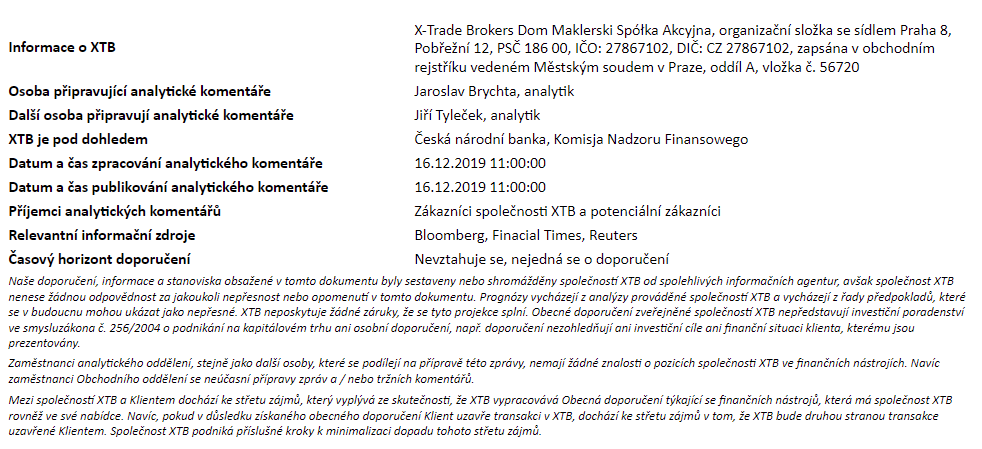 Rozdílové smlouvy jsou komplexní nástroje a v důsledku použití finanční páky jsou spojeny s vysokým rizikem rychlého vzniku finanční ztráty. U 71 % účtů retailových investorů došlo při obchodování s rozdílovými smlouvami u tohoto poskytovatele ke vzniku ztráty. Měli byste zvážit, zda rozumíte tomu, jak rozdílové smlouvy fungují, a zda si můžete dovolit vysoké riziko ztráty svých finančních prostředků. Investování je rizikové. Investujte zodpovědně. Tento materiál je marketingovou komunikací ve smyslu čl. 24 odst. 3 směrnice Evropského parlamentu a Rady 2014/65/EU ze dne 15. května 2014 o trzích finančních nástrojů, kterou se mění směrnice 2002/92/ES a směrnice 2011/61/EU (MiFID II). Marketingová komunikace není investiční doporučení ani informace doporučující či navrhující investiční strategii ve smyslu nařízení Evropského parlamentu a Rady (EU) č. 596/2014 ze dne 16. dubna 2014 o zneužívání trhu (nařízení o zneužívání trhu) a o zrušení směrnice Evropského parlamentu a Rady 2003/6/ES a směrnic Komise 2003/124/ES, 2003/125/ES a 2004/72/ES a nařízení Komise v přenesené pravomoci (EU) 2016/958 ze dne 9. března 2016, kterým se doplňuje nařízení Evropského parlamentu a Rady (EU) č. 596/2014, pokud jde o regulační technické normy pro technická ujednání pro objektivní předkládání investičních doporučení nebo jiných informací doporučujících nebo navrhujících investiční strategie a pro zveřejnění konkrétních zájmů nebo náznaků střetu zájmů nebo jakékoli jiné rady, a to i v oblasti investičního poradenství, ve smyslu zákona č. 256/2004 Sb., o podnikání na kapitálovém trhu. Marketingová komunikace je připravena s nejvyšší pečlivostí, objektivitou, prezentuje fakta známé autorovi k datu přípravy a neobsahuje žádné hodnotící prvky. Marketingová komunikace je připravena bez zohlednění potřeb klienta, jeho individuální finanční situace a nijak nepředstavuje investiční strategii. Marketingová komunikace nepředstavuje nabídku k prodeji, nabídku, předplatné, výzvu na nákup, reklamu nebo propagaci jakýchkoliv finančních nástrojů. Společnost XTB S.A., organizační složka nenese odpovědnost za jakékoli jednání nebo opomenutí klienta, zejména za získání nebo zcizení finančních nástrojů, na základě informací obsažených v této marketingové komunikaci. V případě, že marketingová komunikace obsahuje jakékoli informace o jakýchkoli výsledcích týkajících se finančních nástrojů v nich uvedených, nepředstavují žádnou záruku ani předpověď ohledně budoucích výsledků. Minulá výkonnost nemusí nutně vypovídat o budoucích výsledcích a každá osoba jednající na základě těchto informací tak činí zcela na vlastní riziko.
