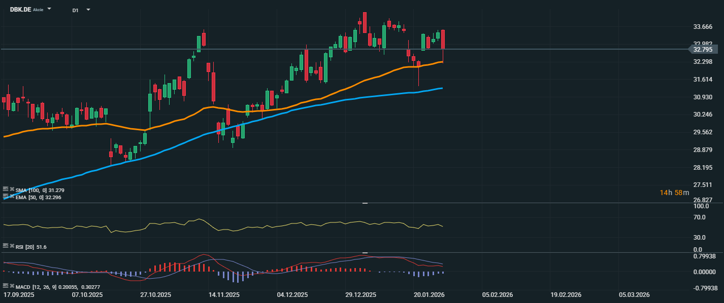 Akcie Deutsche Bank se aktuálně obchodují na úrovni 32,80 EUR, a to po odrazu od 50denního exponenciálního klouzavého průměru (EMA 50) na ceně 32,30 EUR, který sehrál roli krátkodobé podpory. Dlouhodobější SMA 100 se nachází níže na hodnotě 31,28 EUR a rovněž poskytuje technickou oporu v případě hlubší korekce. RSI je aktuálně na hodnotě 51,6, což ukazuje na neutrální nastavení trhu, bez známek překoupení či přeprodanosti. Tento stav dává akciím prostor k dalšímu růstu nebo setrvání v konsolidaci.