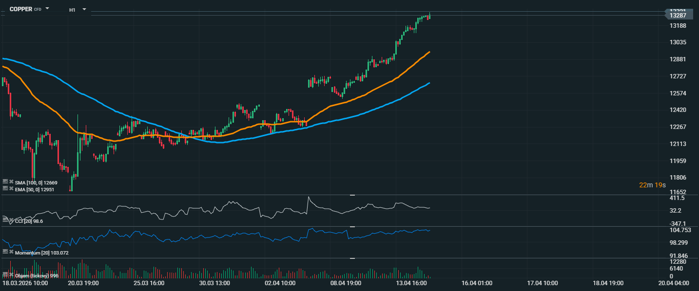 Měď se obchoduje kolem 13 287 USD a drží se vysoko nad klouzavými průměry, konkrétně nad EMA 50 na 12 951 USD i SMA 100 na 12 669 USD. To potvrzuje pokračující býčí trend, který v posledních dnech postupně zesílil. Cena zároveň testuje lokální maxima, což ukazuje na snahu trhu navázat na předchozí růstovou vlnu.