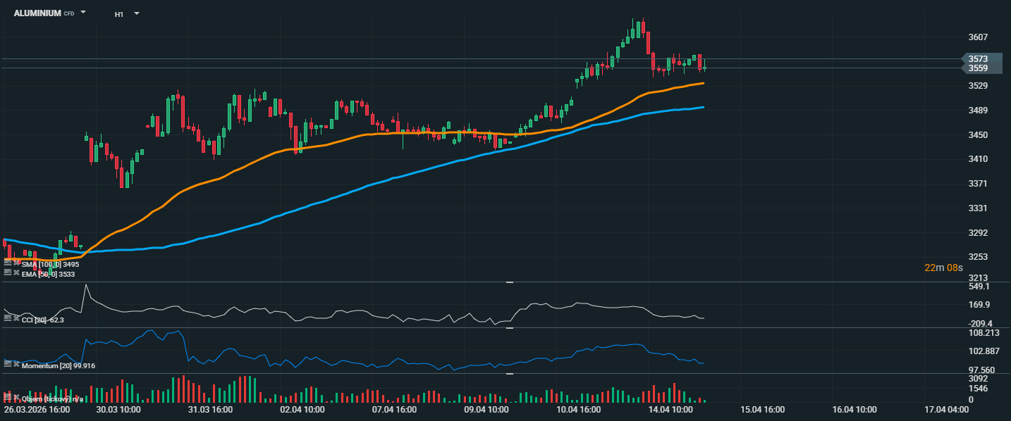 Cena hliníku se pohybuje kolem 3 559 USD a i po krátkodobém oslabení zůstává nad klouzavými průměry, konkrétně nad EMA 50 na 3 533 USD i SMA 100 na 3 495 USD. To potvrzuje, že krátkodobý trend je stále pozitivní, i když po předchozím růstu přišlo viditelné zvolnění. Trh se po dosažení lokálního maxima nad 3 640 USD stáhl a nyní přechází do konsolidace poblíž důležité zóny 3 559 až 3 573 USD.