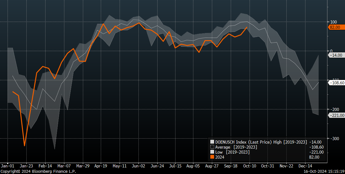 Stále se zdá, že existuje šance na podobný krok jako v loňském roce, kdy po převrácení smlouvy došlo k prudkému nárůstu o 10 %. Poklesy však začaly počátkem listopadu, kdy má dojít k prvnímu poklesu zásob. Ten však může přijít později, než by naznačovala sezónnost, při pohledu na výhled počasí.