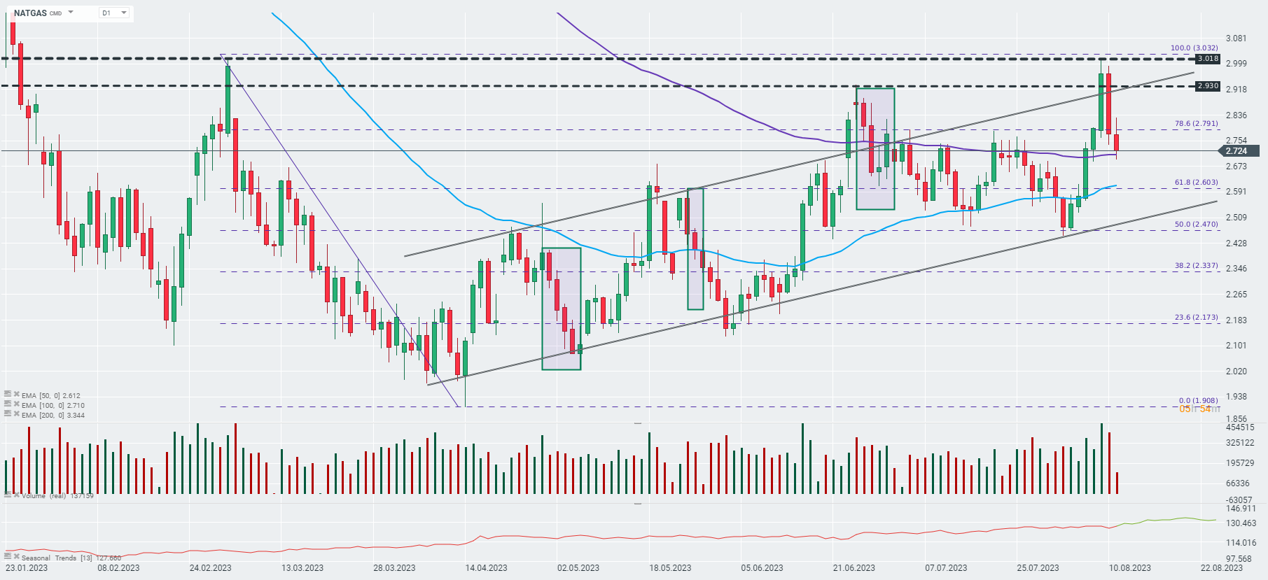 NATGAS v současné době testuje podporu stanovenou 100denním exponenciálním klouzavým průměrem (fialová křivka). Zdroj: xStation 5