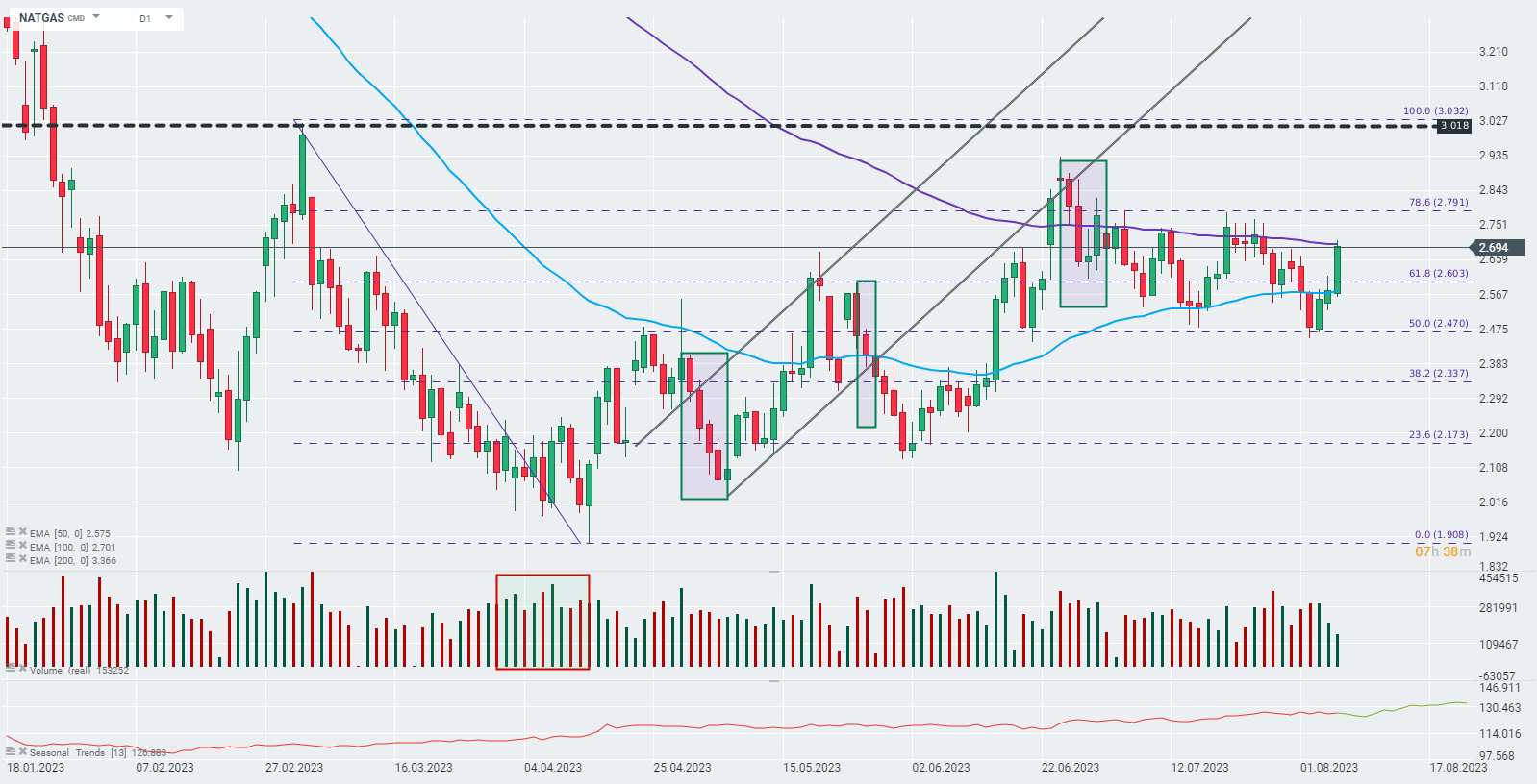 NATGAS dnes posiluje o téměř 5 % a testuje hranici stanovenou 100denním exponenciálním klouzavým průměrem (fialová křivka). Zdroj: xStation 5