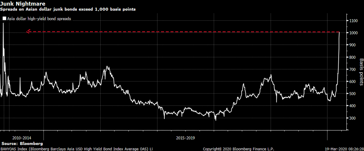 Panický režim v posledních dnech nepanuje pouze na trzích v Evropě a v USA. Útěk k bezpečným přístavům se velmi dotýká také Asie. Krásně to jde vidět hlavně na dramatických změnách u tamních korporátních dluhopisů, kde cena zajištění před bankrotem (CDS) vzrostla na nejvyšší úrovně od roku 2016. Ještě více závažný je však růst spreadů na korporátním dolarovém dluhu, který nespadá do investičního stupně – junk bonds. Tady spready doslova explodovaly na 1 000 bazických bodů a jsou tak nyní 10 % nad „bezrizikovou sazbou“. V kombinaci s rostoucím dolarem a kolapsem poptávky ze zahraničí se jedná o smrtící koktejl.