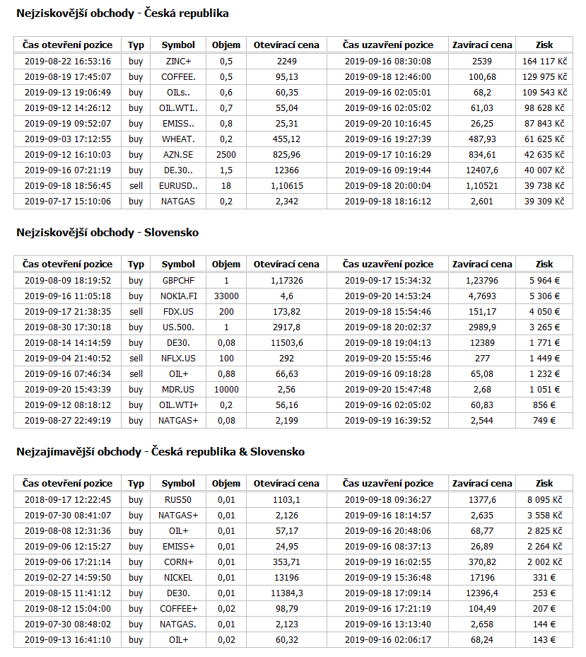 V minulém týdnu se nejvíce dařilo obchodníkovi z Česka. Obchod na průmyslovém kovu zinku mu přinesl navýšení reálného účtu o 164 tisíc korun. Nákupní pozici o objemu 0,5 lotů zobchodoval v průběhu tří týdnů. Trader vstoupil do obchodu 22. srpna na úrovni 2249 USD/MT a realizace pozice proběhla 16. září na ceně 2539. Celkový pohyb trhu ve prospěch obchodu dosáhl na 290 dolarů.