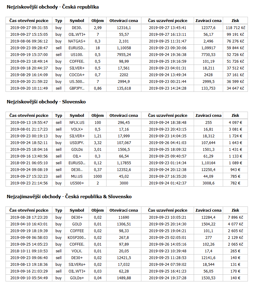 Tabulky: Nejlepší obchody na reálných účtech XTB v minulém týdnu