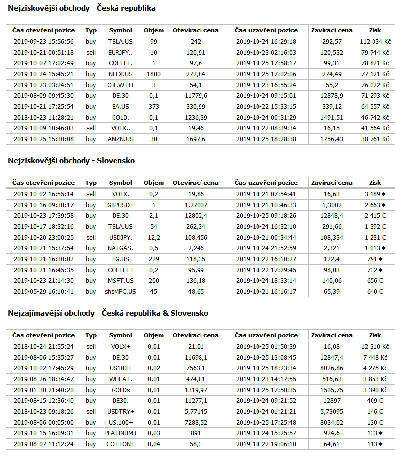 Tabulky: Nejlepší reálné obchody XTB minulého týdne na uvedených instrumentech