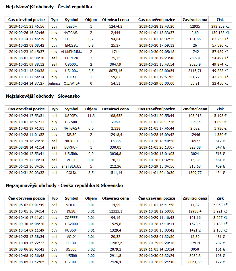 Tabulky: Nejlepší obchody týdne na uvedených instrumentech