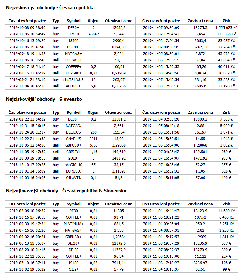 Tabulky: Nejlepší obchody na reálných účtech XTB na uvedených instrumentech