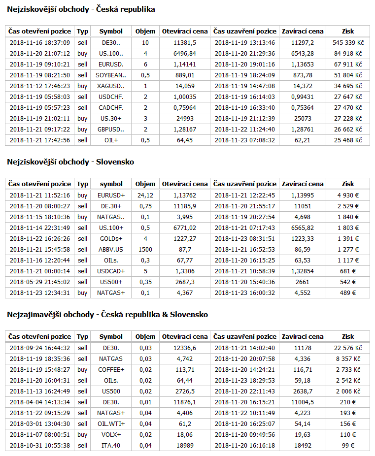 V minulém týdnu se nejvíce dařilo traderovi z Česka na německém DAXu (de.30), který na své pozici vydělal více než půl milionu korun! Prodejní příkaz o objemu 10 lotů realizoval mezi hladinami 11381,5 (16. listopadu 2018) a 11297,2 (19. listopadu 2018). Pohyb ve prospěch obchodníka přesáhl 84 bodů.