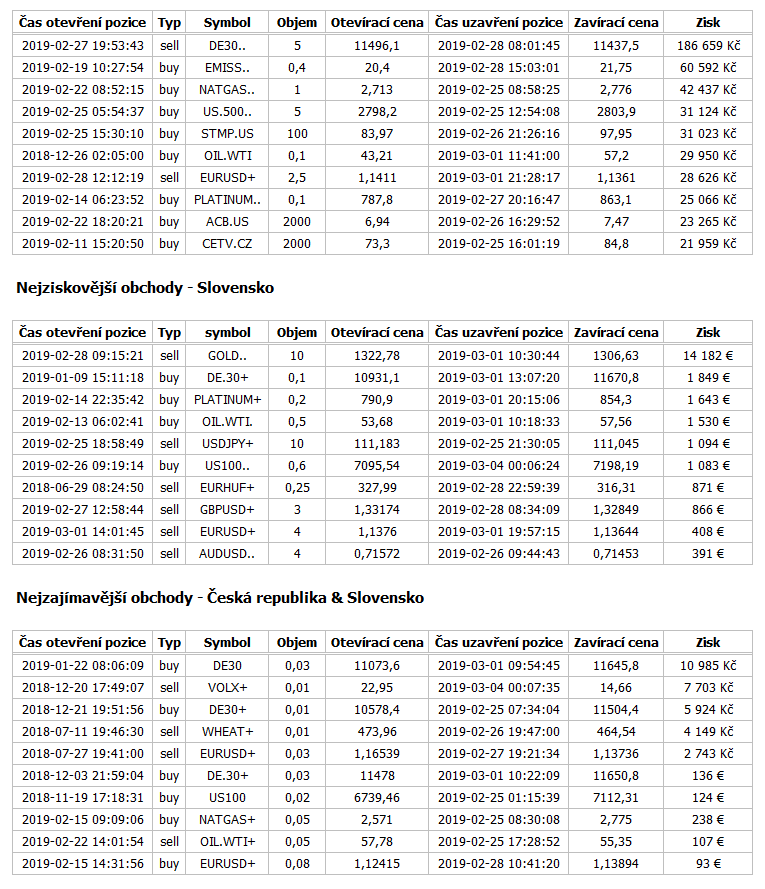 Nejvýnosnější obchod minulého týdne realizoval obchodník ze Slovenska na zlatě. Short pozicí o velikosti 10 lotů inkasoval zisk na reálný účet ve výši celkem 14 182 euro. Do pozice vstoupil 28. února na ceně 1322,78 dolarů za unci a k realizaci pozice došlo hned následující seanci na úrovni 1306,63 dolarů. Celkový pohyb ve prospěch obchodníka dosáhl na 16 dolarů a 15 centů.