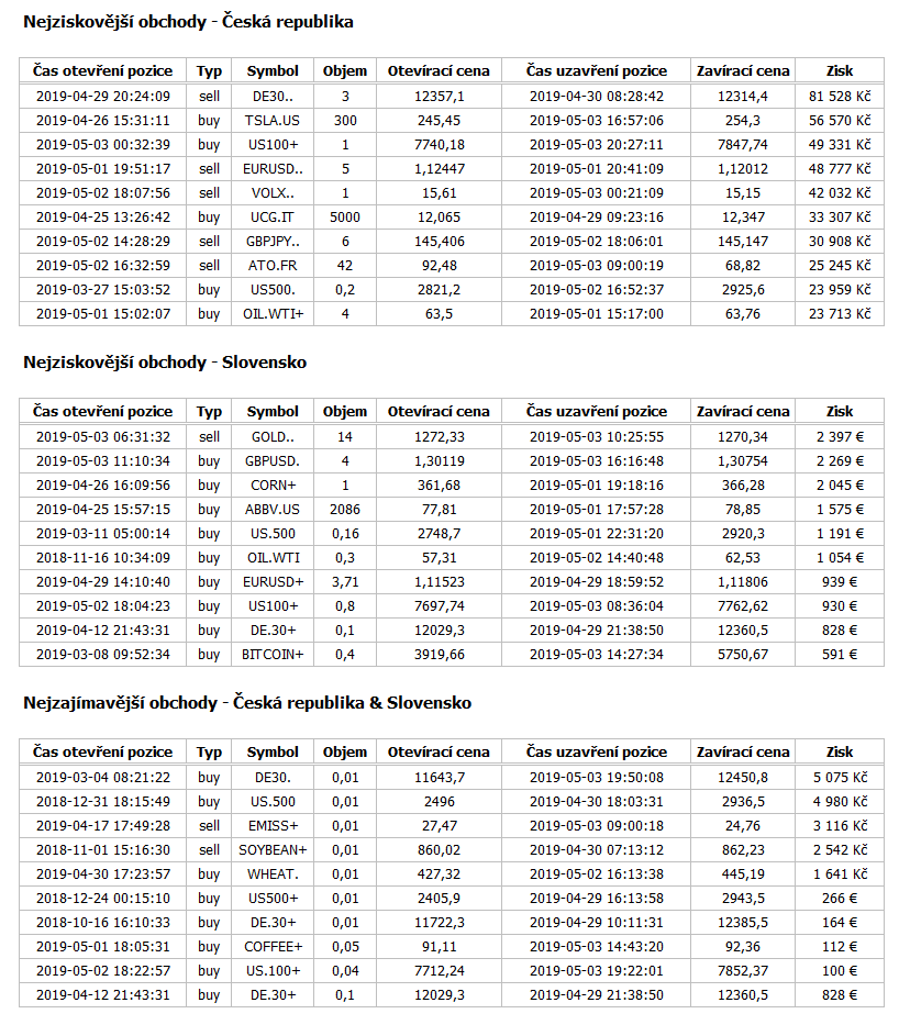 Tabulky: Nejlepší obchody na uvedených instrumentech