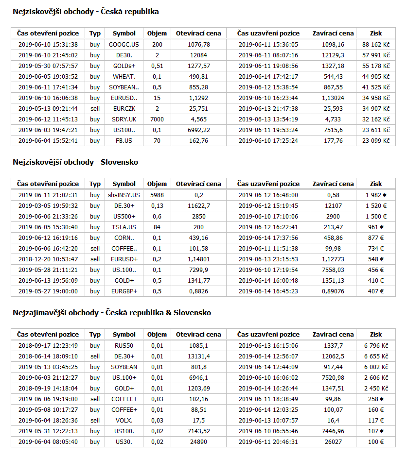 Tabulka: Nejlepší reálné obchody na uvedených instrumentech