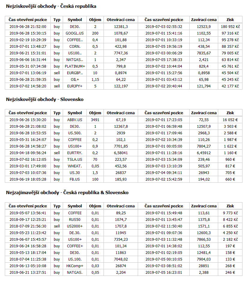 Tabulky: Nejlepší obchody na uvedených instrumentech