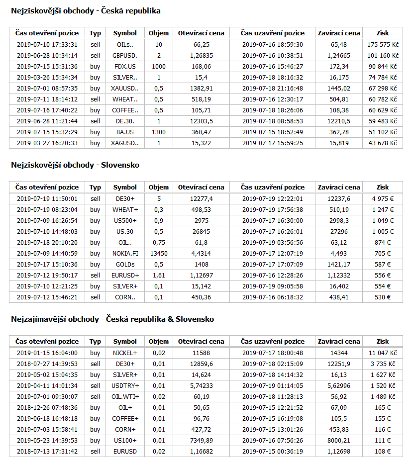 Obchod s nejvyšším ziskem na reálných účtech XTB ve výši 175 tisíc korun realizoval obchodník z Česka na ropě Brent. Prodejní pozici o velikosti 10 lotů zobchodoval během pěti obchodních seancí. Vstup od obchodu proběhl 10. července na úrovni 66,25 USD/bbl a obchod byl uzavřen 16. července na úrovni 65,48 USD/bbl. Celkový pohyb trhu ve prospěch obchodu se vyšplhal na "pouhých" 77 centů.
