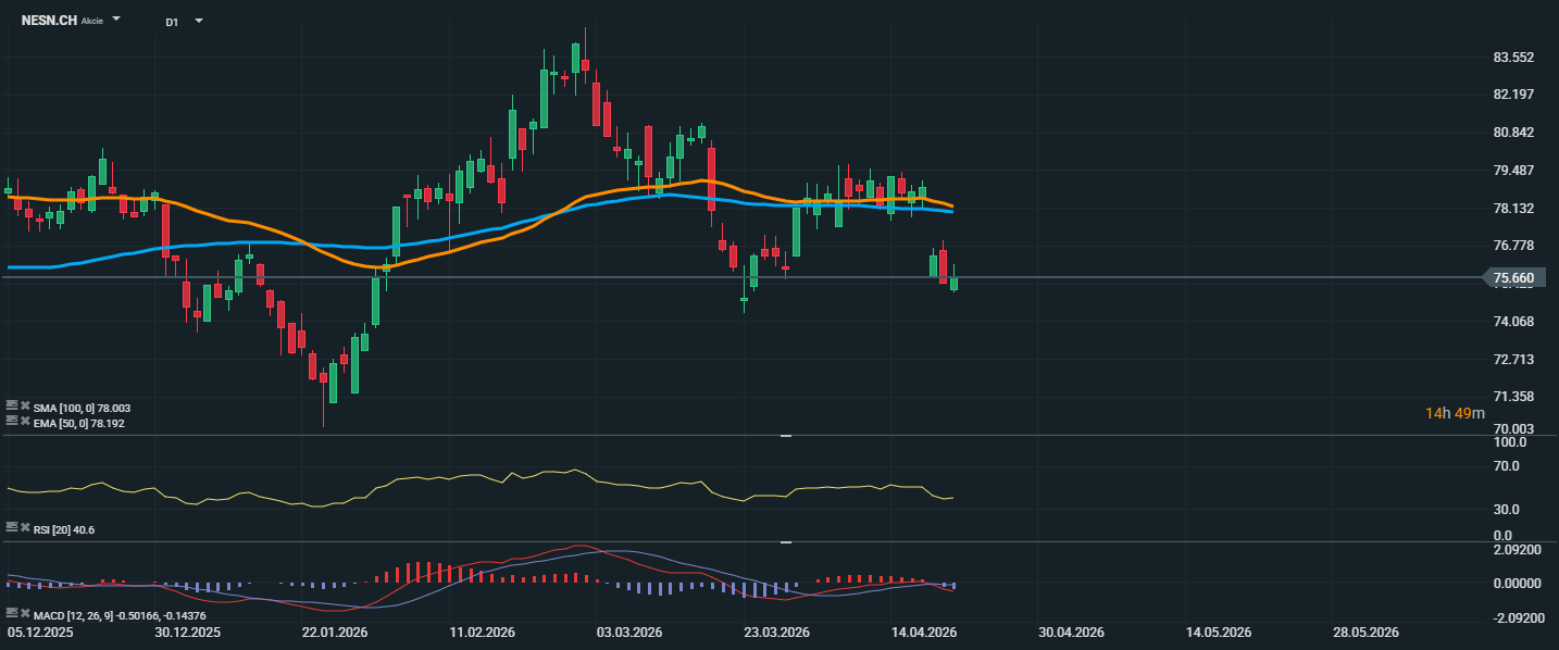 Akcie společnosti Nestlé se aktuálně obchodují kolem 75,66 CHF a technický obraz se v posledních dnech zhoršil. Cena se propadla pod oba klíčové klouzavé průměry, tedy pod EMA 50 na 78,19 CHF i SMA 100 na 78,00 CHF, což ukazuje na převahu prodejců a slábnoucí střednědobý trend. Po předchozí konsolidaci v pásmu kolem 78 až 79 CHF přišel výraznější pokles, který poslal titul zpět k důležité podpůrné oblasti poblíž 75,7 CHF. RSI se nachází na hodnotě 40,6, což signalizuje oslabené momentum, ale zatím ne přeprodaný stav. To znamená, že prostor pro další pokles stále existuje.