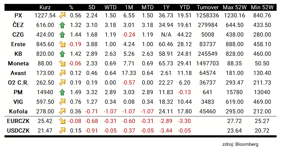 Obchodování na finančních trzích se v průběhu úterní seance nese v pozitivním duchu. Po včerejším mírném poklesu zaznamenal index PX opět růst. Přidal 0,54 % a zakončil na úrovni 1 227,54 bodů. Opět tak vylepšil nejvyšší úrovně od roku 2011. Objem obchodů dosáhl na 391 mil. korun.