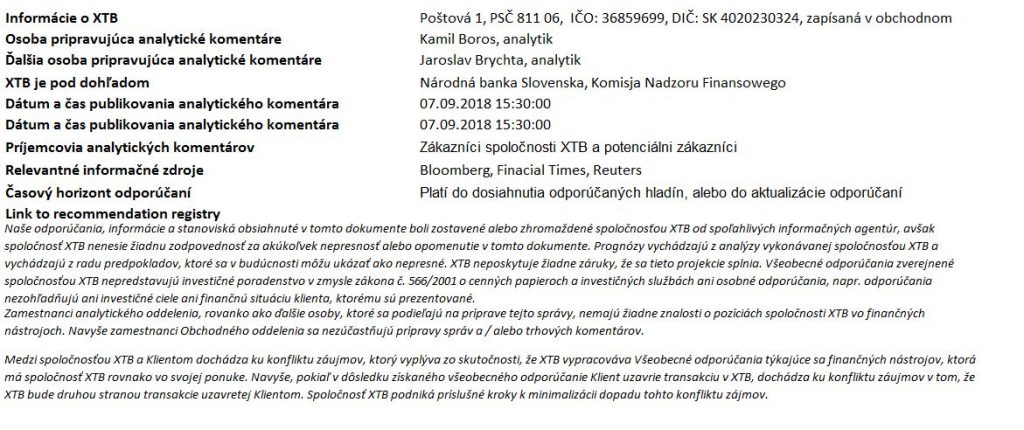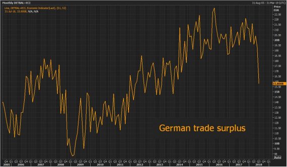 Mimoriadne negatívne dnes prekvapila aj obchodná bilancia. Tá ukázala najnižší prebytok za posledné štyri roky. Bolo to dielom aj importov aj exportov. Importy poskočili na rekordnú úroveň, exporty zase klesli medzimesačne o 0,9%. Určitý vplyv už môžu mať obchodné vojny (aktuálne predovšetkým oceľ). Tak či onak, pokles obchodného prebytku pôjde do kalkulácie HDP s mínusom, čiže tretí kvartál môže byť v konečnom dôsledku pre ekonomiku slabší. Pokiaľ by to tak bolo, tak sa vidina zvyšovania úročenia ECB môže vzdialiť ešte viac, čo by bola pre euro zlá správa.