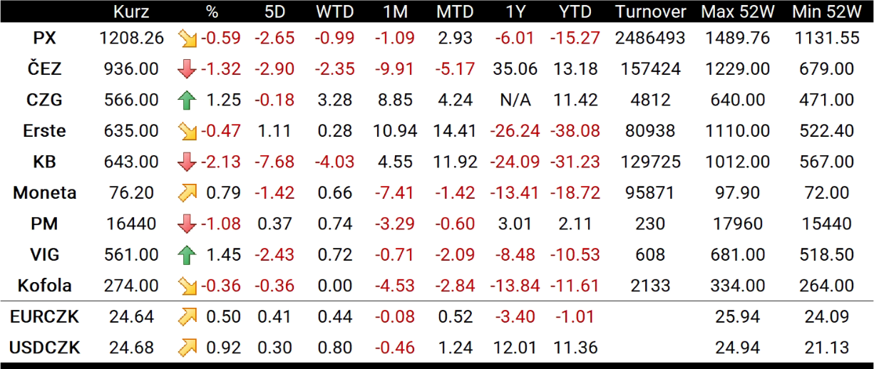 Nejvýkonnějším titulem dnes byla Vienna Insurance Group (VIG.CZ), která zvrátila negativní sentiment z pondělní seance a pomalu odepisuje ztráty z minulého týdne. V solidních ziscích pokračovala Česká zbrojovka (CZG.CZ), kterou čeká již ve čtvrtek zveřejnění výsledků hospodaření za 2. čtvrtletí letošního roku. Největší ztráty si dnes připsala Komerční banka (KOMB.CZ), ty činily 2,47 %. V červených číslech skončila i ERSTE (RBAG.CZ), jež ztratila 0,47 % a uzavřela na 635 Kč. Naopak Moneta (MONET.CZ) se dnes stala jednou ze tří ziskových titulů BCPP.