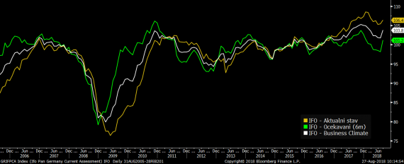 Máme za sebou první, a tuto seanci asi jediná, důležitá data. Jedná se o výsledky německého indexu IFO, který mapuje kondici více než 7 tis. německých firem. Čísla jsou už na první pohled povzbudivá a potvrzují, že se situace v Německu, po zpomalení z první poloviny roku, začíná znovu měnit k lepšímu. Index IFO v srpnu začal výrazně růst, když vyskočil ze 101,7b. na 103,8b., zatímco trh počítal se stagnací mírně pod hranicí 102b. Výrazně si oproti minulému měsíci polepšil hlavně index očekávání, který je indikátorem optimismu německých firem do nadcházejících šesti měsíců. Ten rostl o téměř 3b. na 101,2b. Růstu se pak dočkal také index aktuální kondice firem, který se vyhoupl na 106,4b.